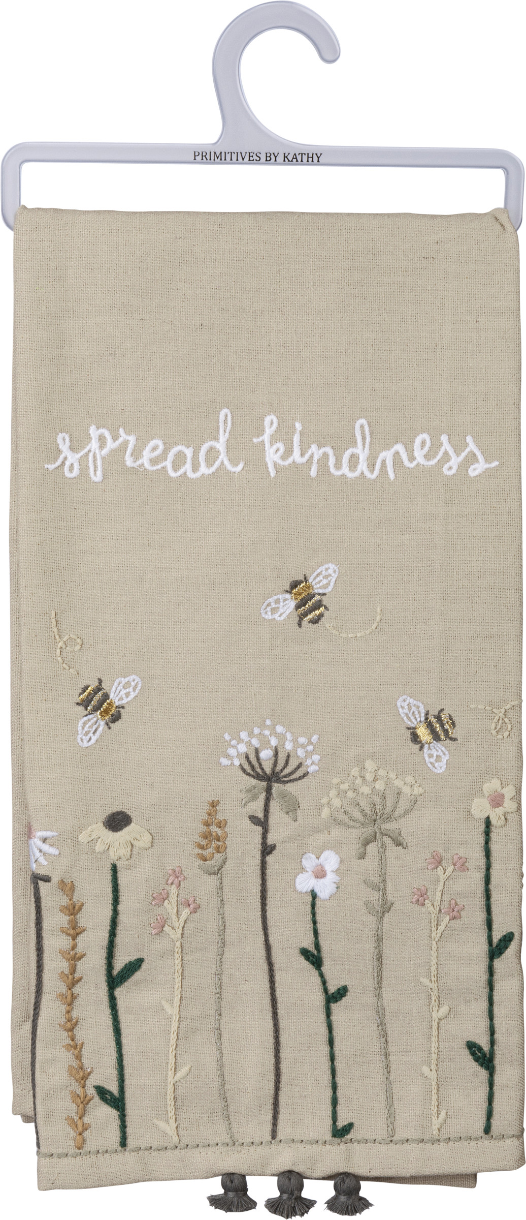 A linen-blend kitchen towel featuring an embroidered "Spread Kindness" sentiment with floral and bumblebee designs, metallic accents, and tassel trim details. Complements well with coordinating pieces in collection for a charming spring display. Machine-washable.