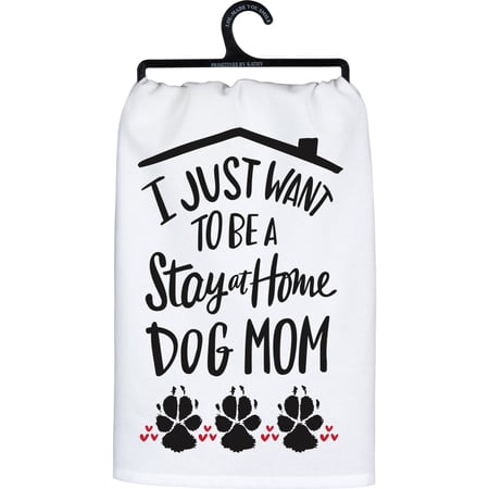 A black and white cotton kitchen towel displaying a unique hand illustrated design of dog paw prints and a house roof with a fun dog inspired sentiment that reads "I Just Want To Be A Stay At Home Dog Mom." Our Dog Mom kitchen towel is conveniently machine-washable for easy cleaning. Funny kitchen towel is packaged on a black plastic hanger to easily display on rack. A fun pet-themed kitchen accessory perfect for everyday use.