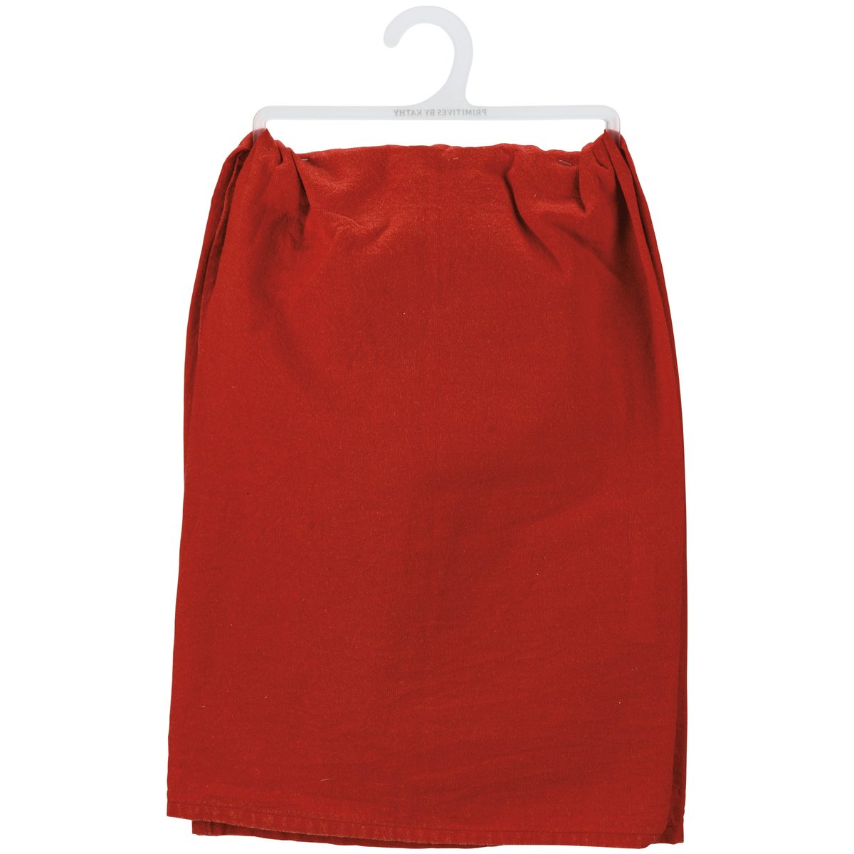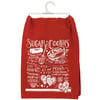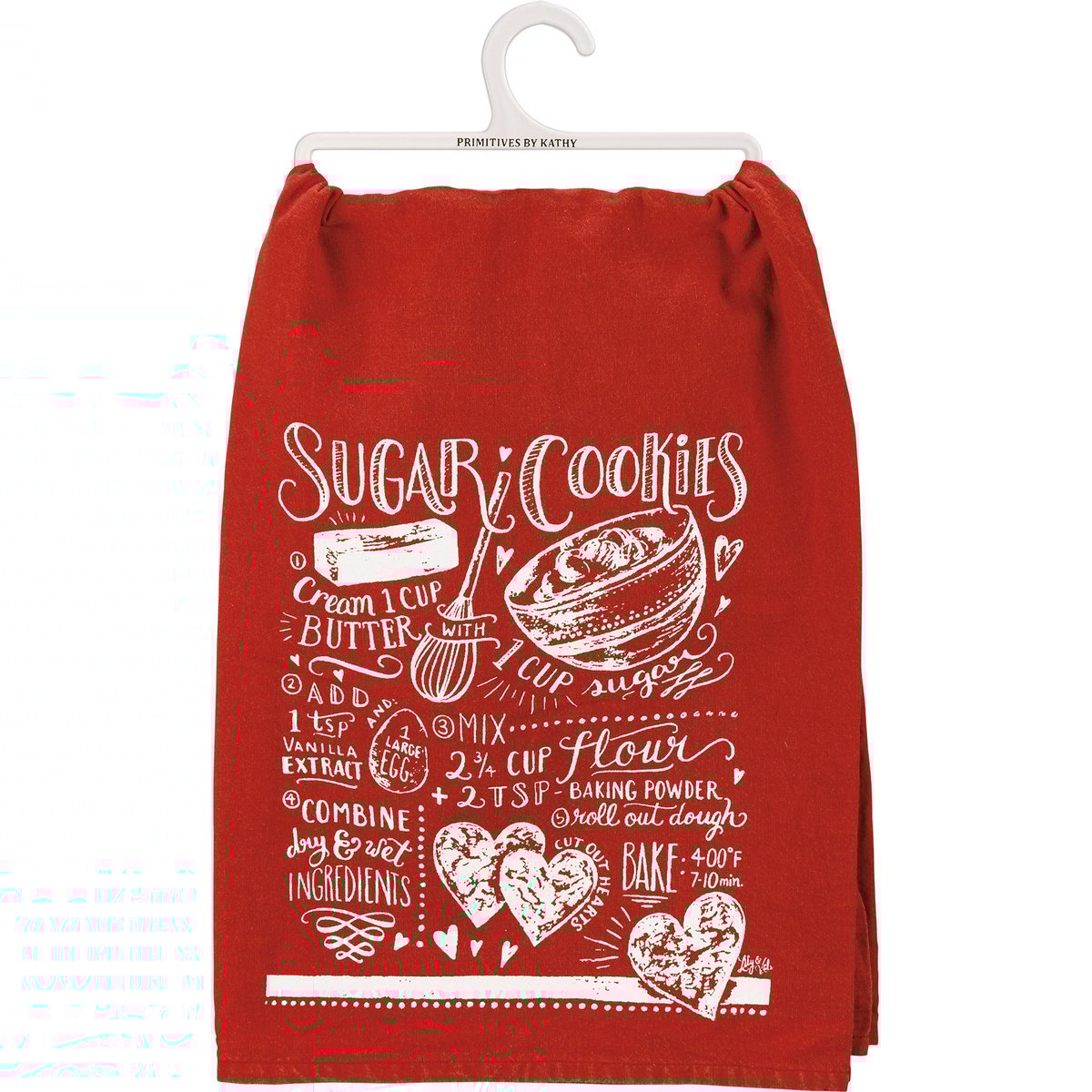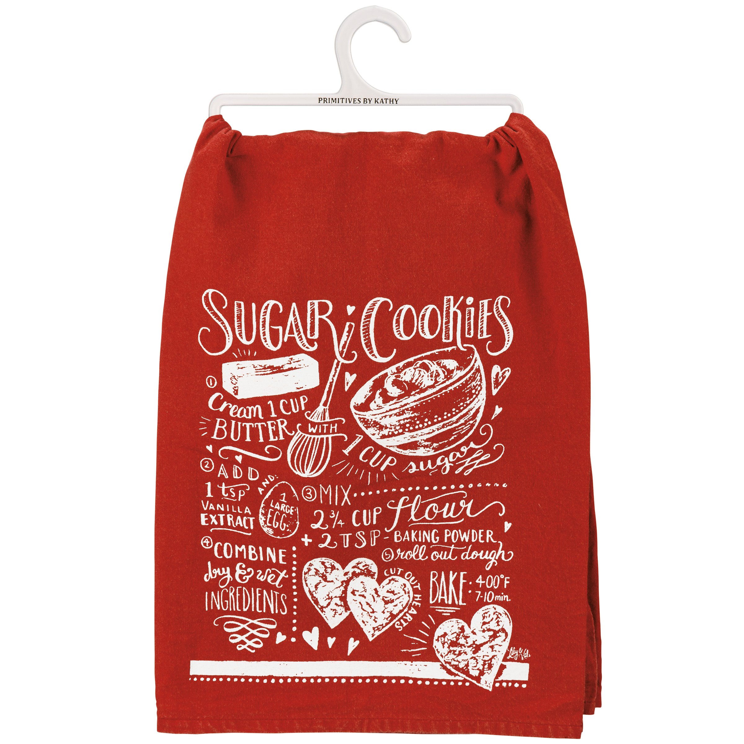 A red cotton kitchen towel featuring a hand lettered "Sugar Cookies" sentiment with an included recipe and chalk art sugar cookie-themed designs. Our Sugar Cookies kitchen towel is machine-washable.