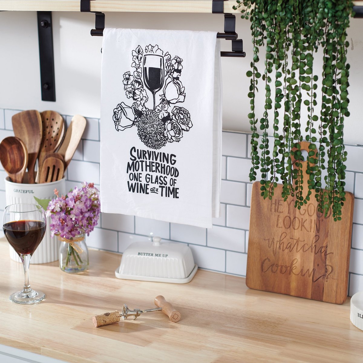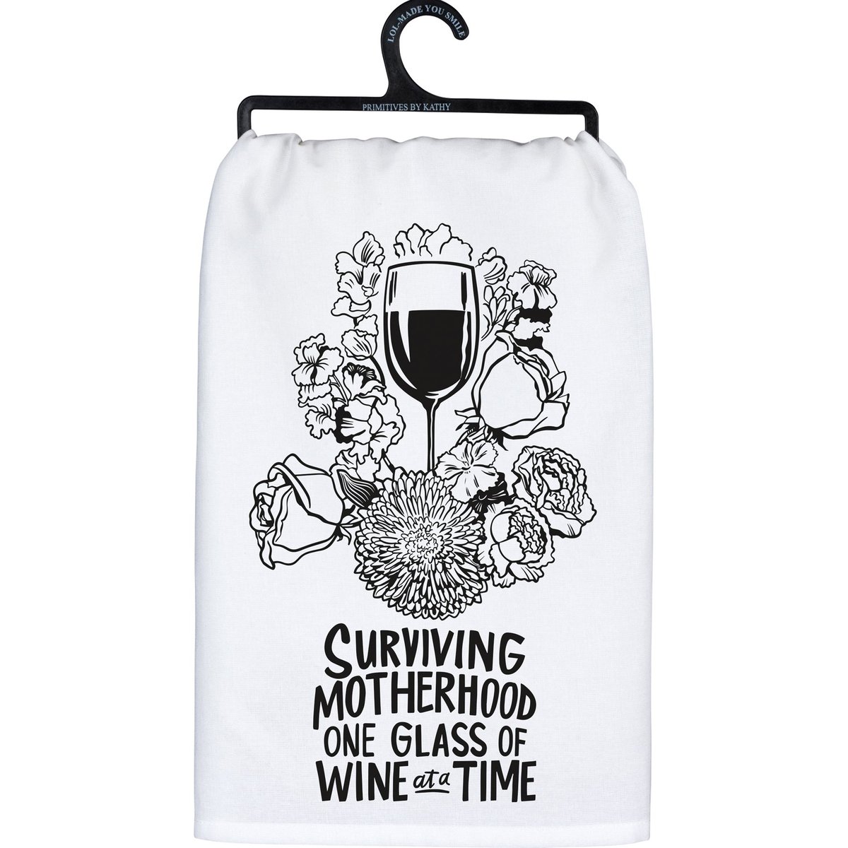 A black and white cotton kitchen towel from our Mother's Day Collection displaying a charming hand illustrated design of a glass of wine surrounded by flowers with humorous "Surviving Motherhood One Glass Of Wine At A Time" sentiment. Our Surviving Motherhood kitchen towel is machine-washable for convenient cleaning. Packaged on a black plastic hanger with hook to easily hang on rack.