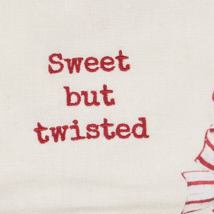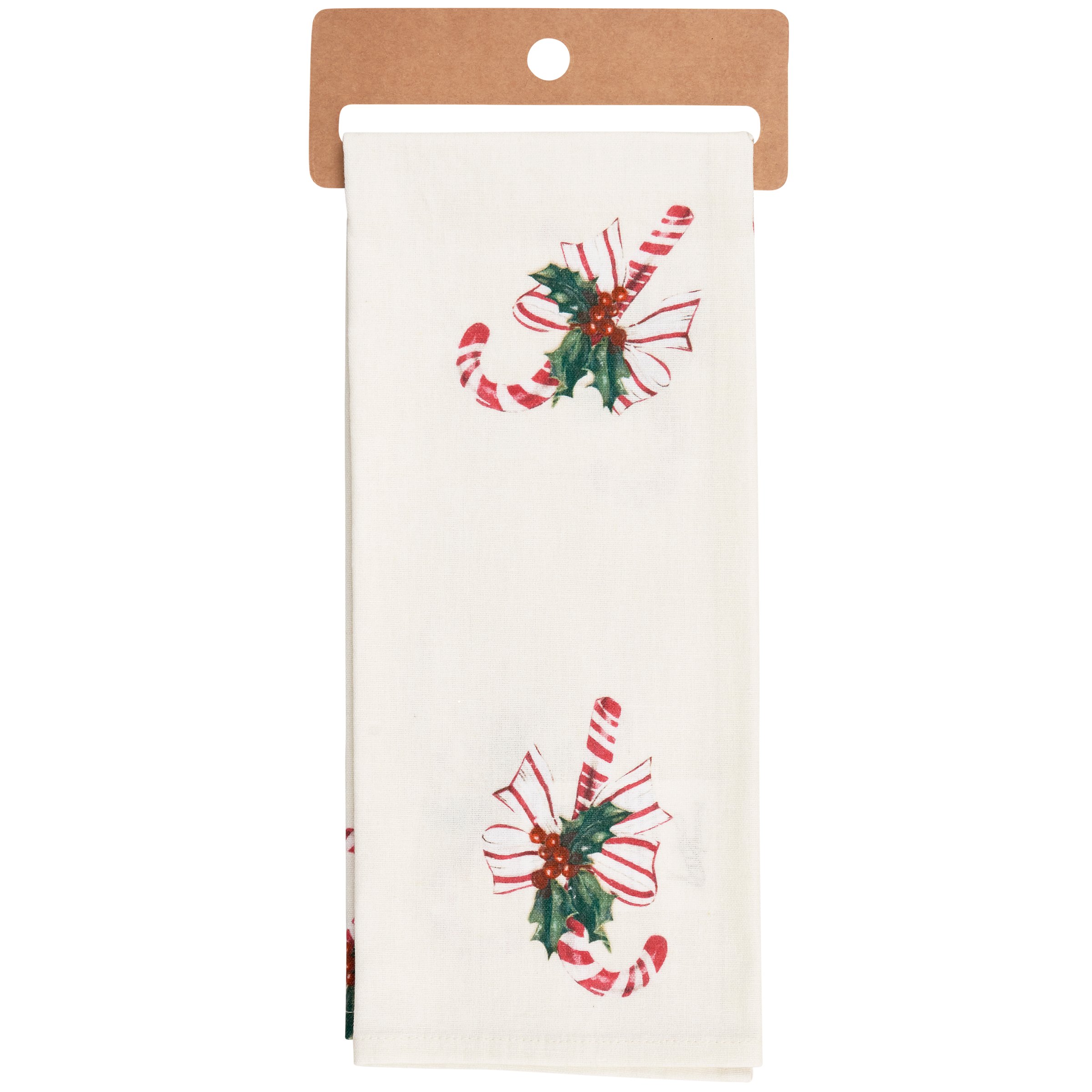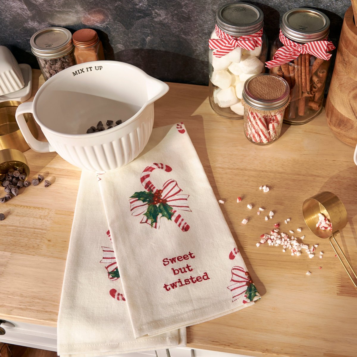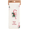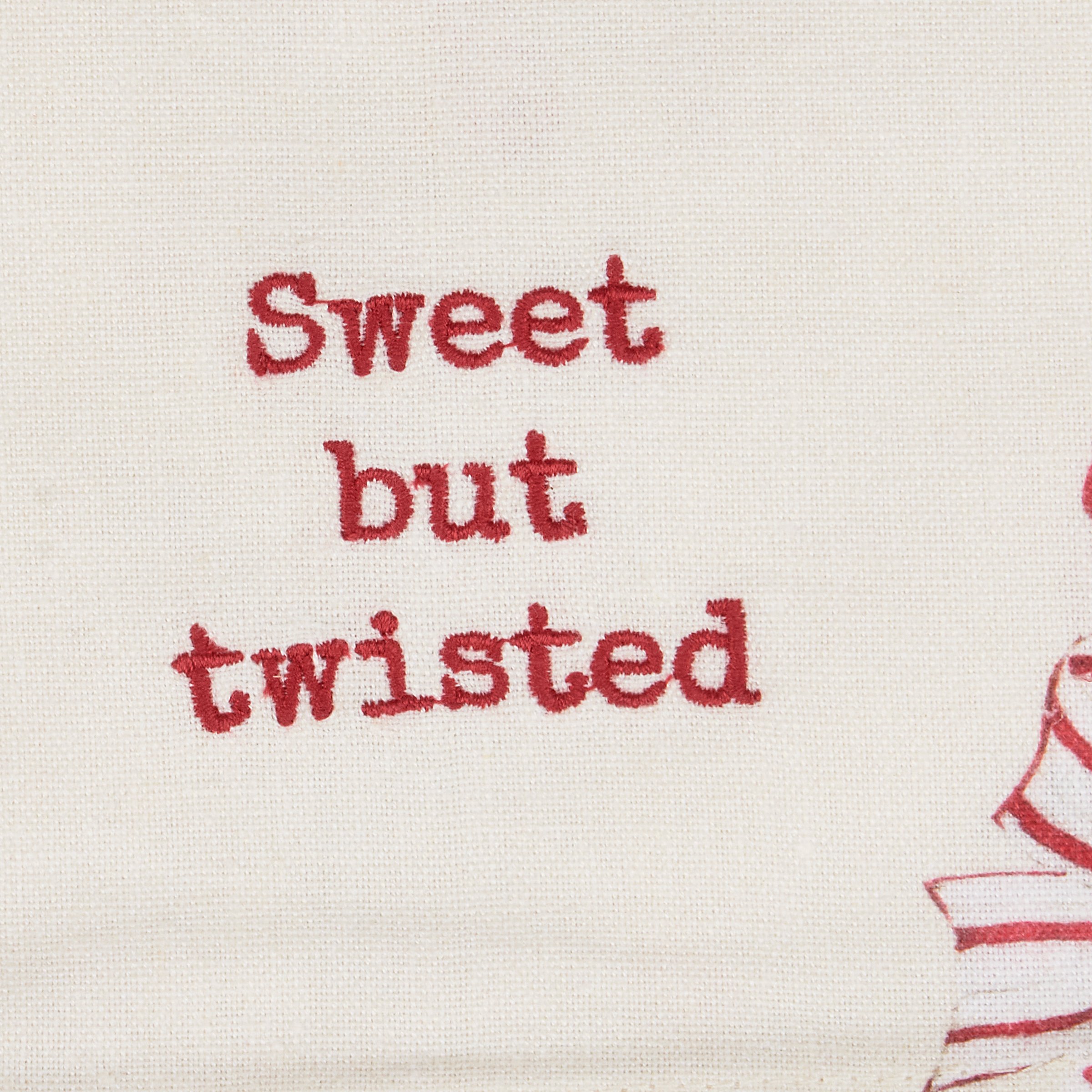 A cotton-linen kitchen towel from our Christmas Collection displaying all-over vintage designs of candy canes with a coordinating Christmas inspired pun that reads "Sweet But Twisted." Sentiment is embroidered for added interest. Our Sweet But Twisted kitchen towel is conveniently machine-washable for easy cleaning. Seasonal kitchen towel is packaged on a cardboard hanger with hole to easily display on rack. A fun Christmas-themed kitchen accessory perfect for seasonal use.