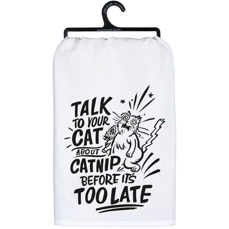 A black and white cotton kitchen towel from our Pet Collection displaying a playful hand illustrated design of a cat going wild from catnip with a funny cat inspired sentiment that reads "Talk To Your Cat About Catnip Before It's Too Late." Our Talk To Your Cat About Catnip kitchen towel is conveniently machine-washable for easy cleaning. This funny kitchen towel is packaged on a black plastic hanger to easily display on rack. A fun cat themed gift perfect for adding personality to any kitchen while showing off a love for pets.
