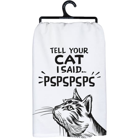 A black and white cotton kitchen towel from our Pet Collection displaying a fun hand illustrated design of a cat with a humorous cat-themed sentiment that reads "Tell Your Cat I Said... Pspspsps." Our Tell Your Cat kitchen towel is conveniently machine-washable for easy cleaning. Funny kitchen towel is packaged on a black plastic hanger to easily display on rack. A fun pet-themed gift perfect for an everyday kitchen accessory.