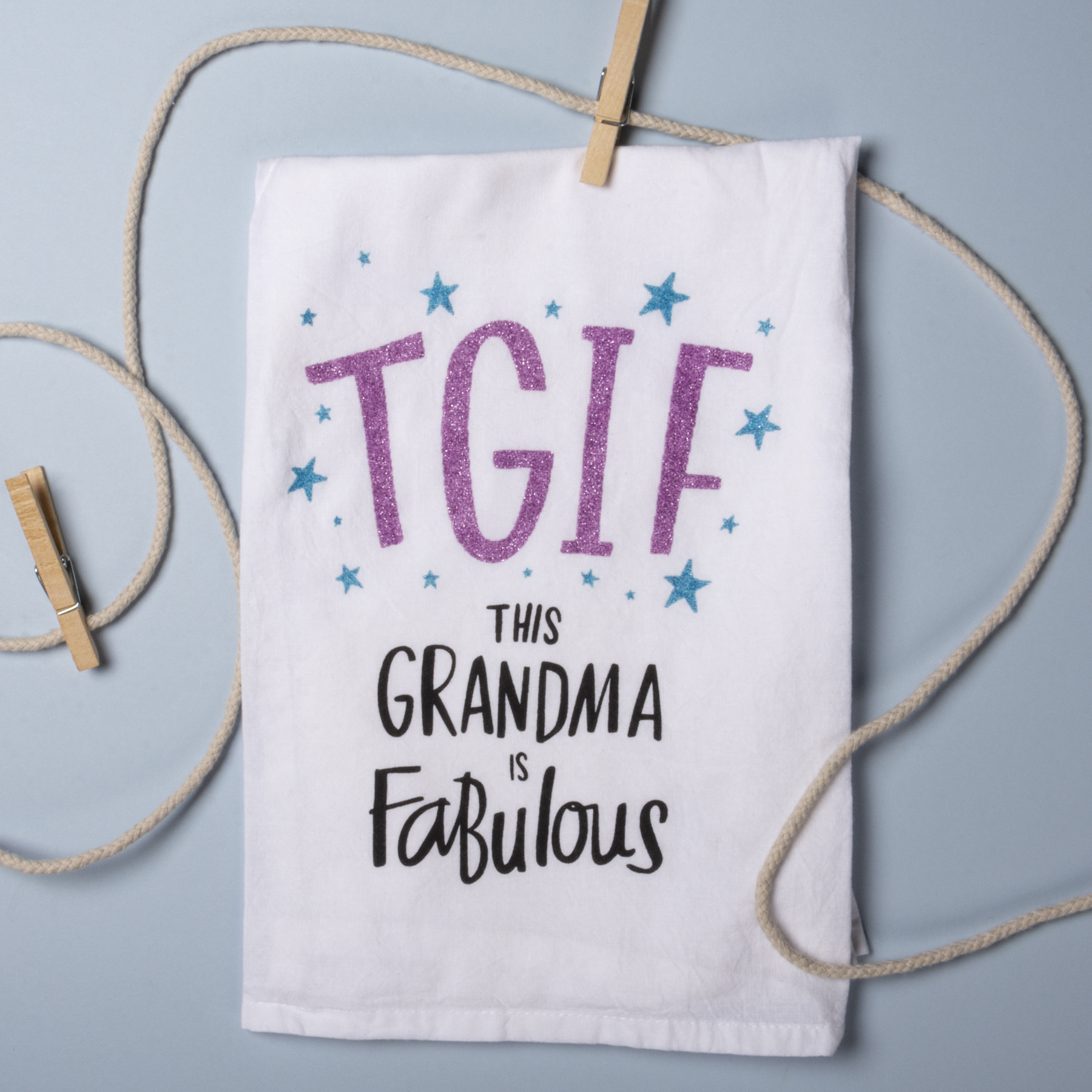 A cotton kitchen towel lending a "TGIF - This Grandma Is Fabulous" sentiment with star designs and rich-pigmented glitter accents. Machine-washable; glitter will not transfer.