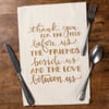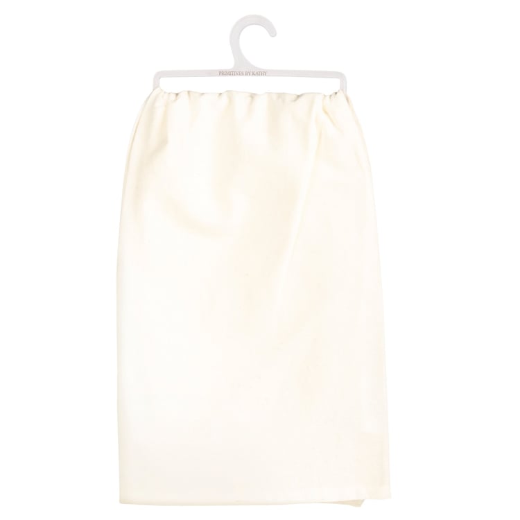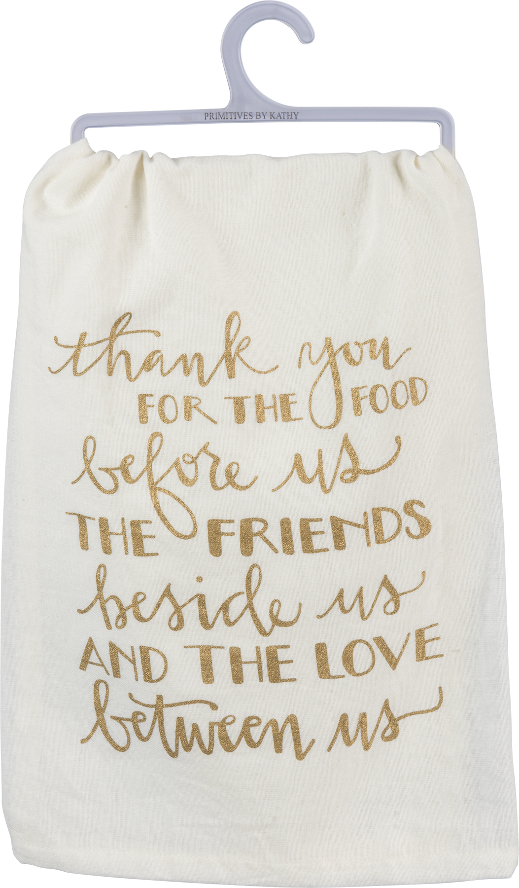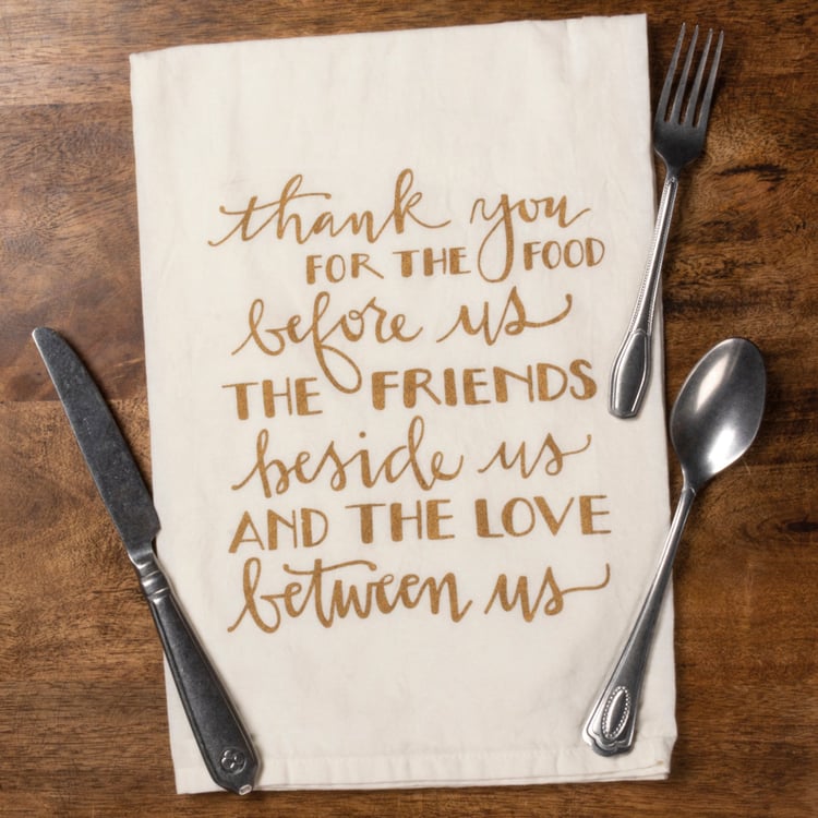 A cotton kitchen towel featuring a hand lettered "Thank You For The Food Before Us The Friends Beside Us And The Love Between Us" sentiment in a neutral metallic palette that complements well with existing decor or coordinating design pieces. Machine-washable.