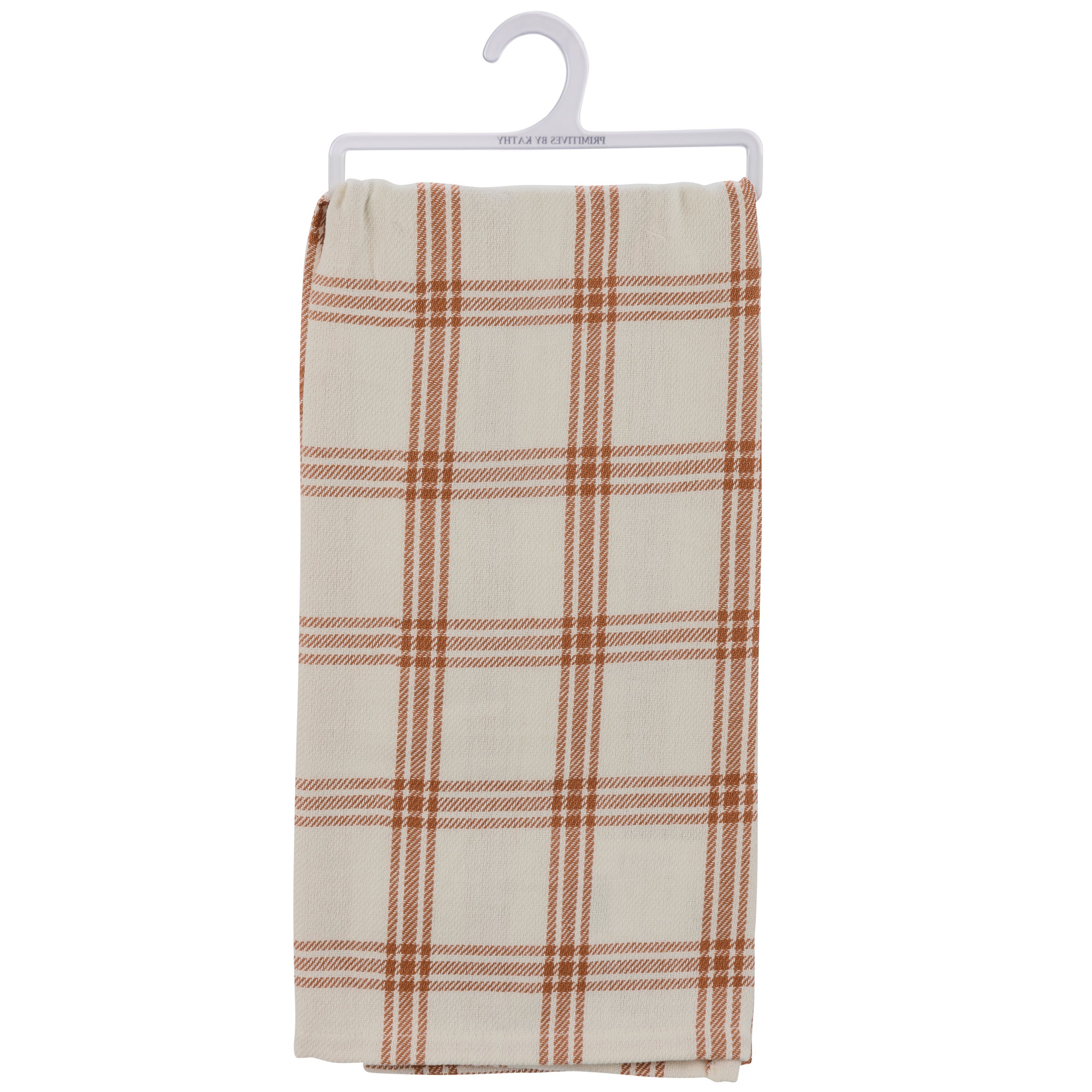 A cotton kitchen towel featuring hand lettered embroidered "Thankful Grateful Blessed" sentiment and orange and cream plaid pattern. Our Thankful Grateful Blessed kitchen towel is machine-washable.