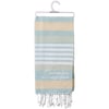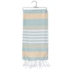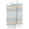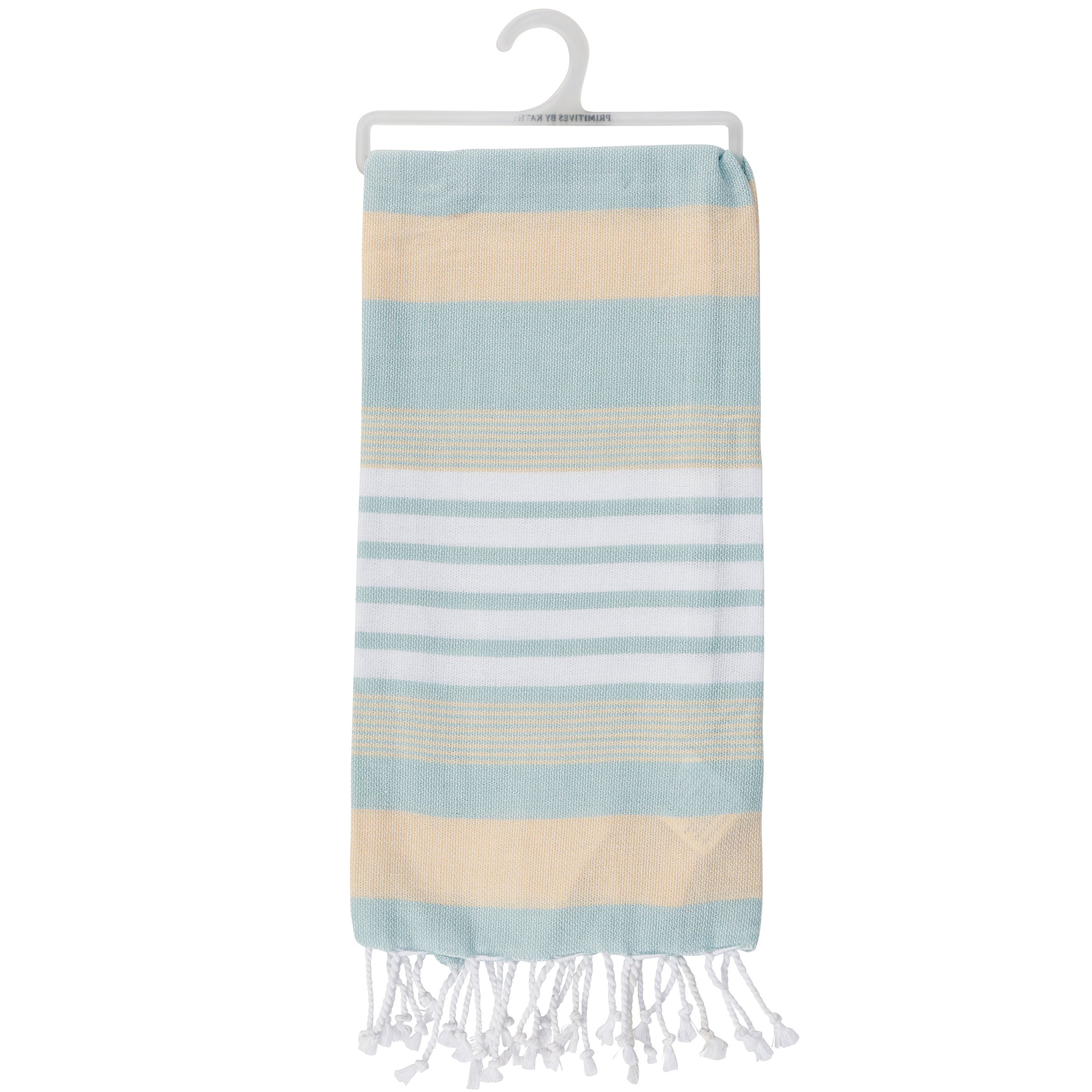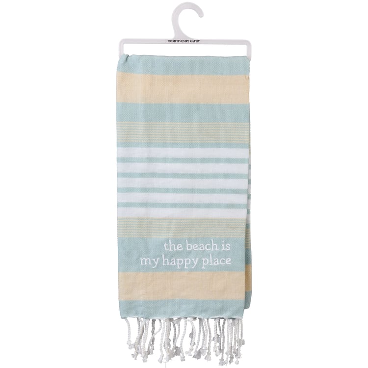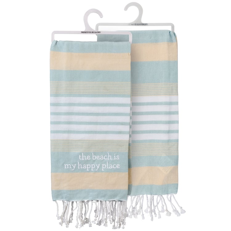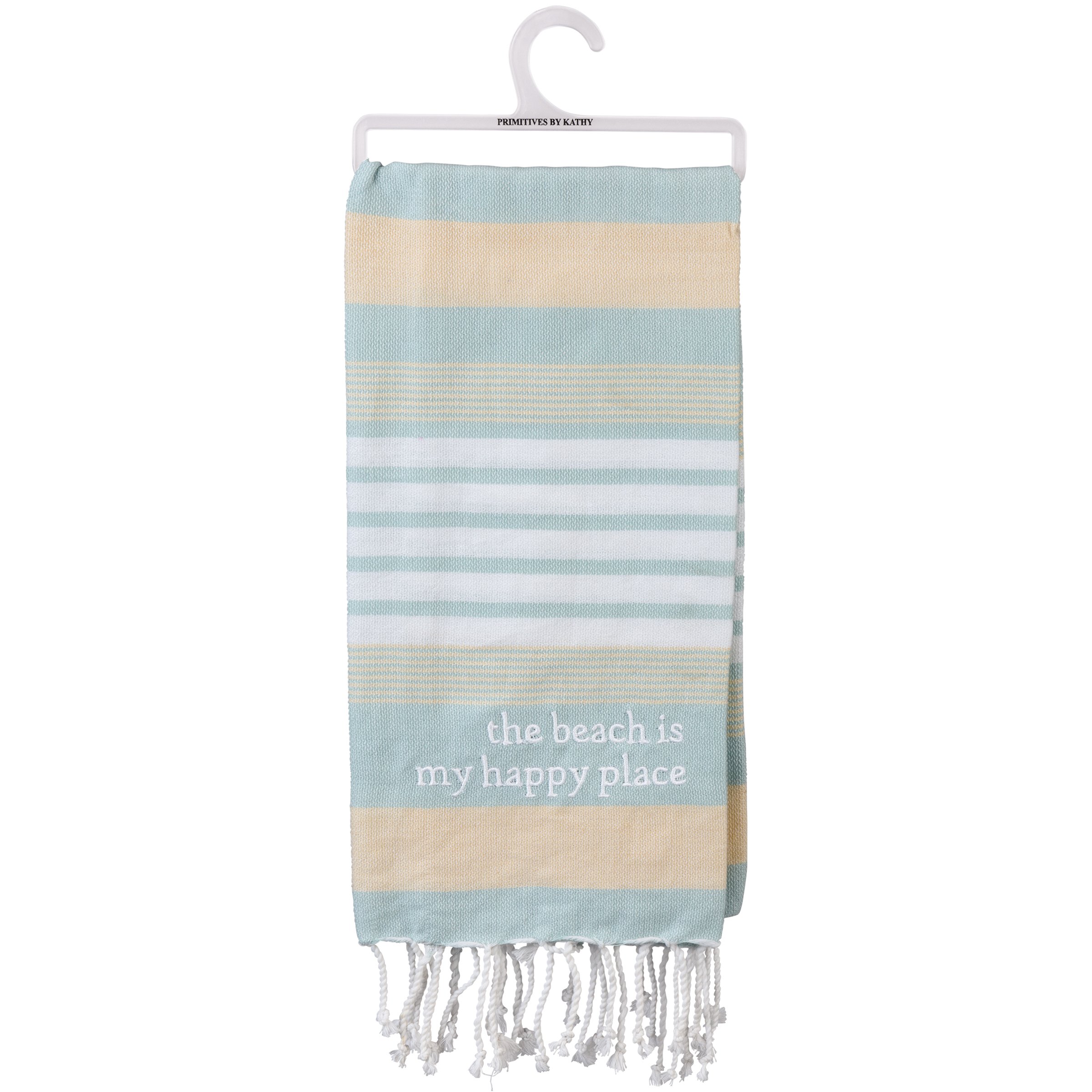 A cotton kitchen towel featuring a subtle embroidered "The Beach Is My Happy Place" sentiment with neutral beach-inspired woven striped accents of varying sizes. Machine-washable. Complements well with coordinating pieces in collection for a cohesive display that's perfect for the beach.