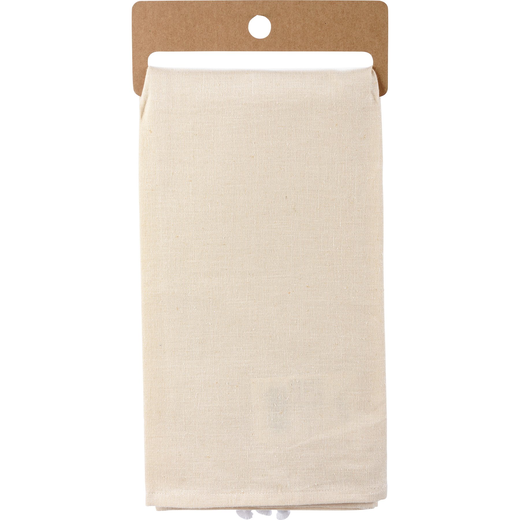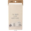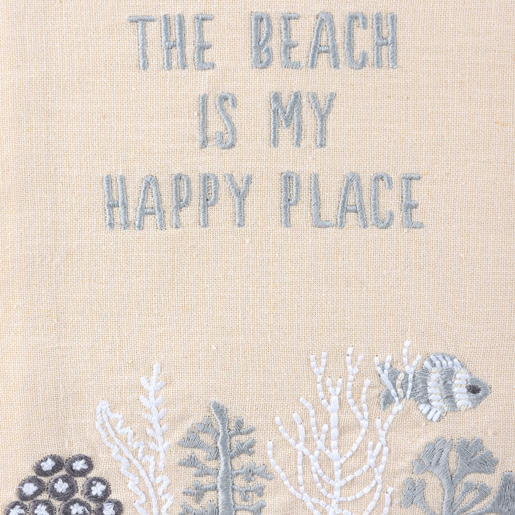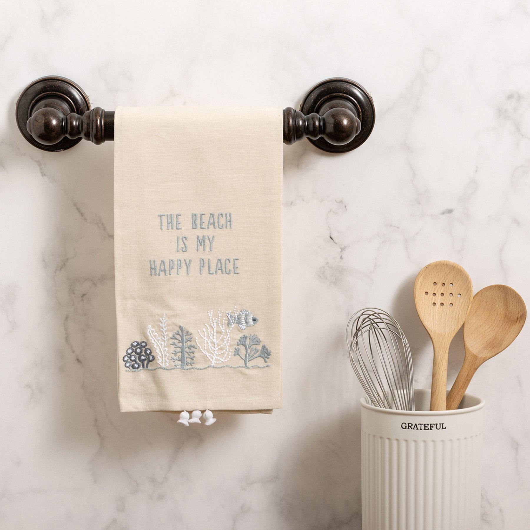 A cotton linen blend kitchen towel featuring a stitched art panel with embroidered "The Beach Is My Happy Place" sentiment with fish and coral reef design. Features tassel accents for added interest. Our The Beach Is My Happy Place kitchen towel is machine-washable. Towel is packaged on a cardboard hanger with a hole to easily hang a rack.
