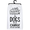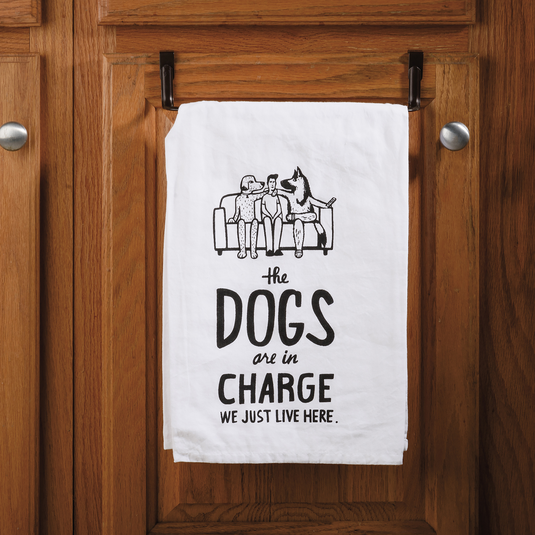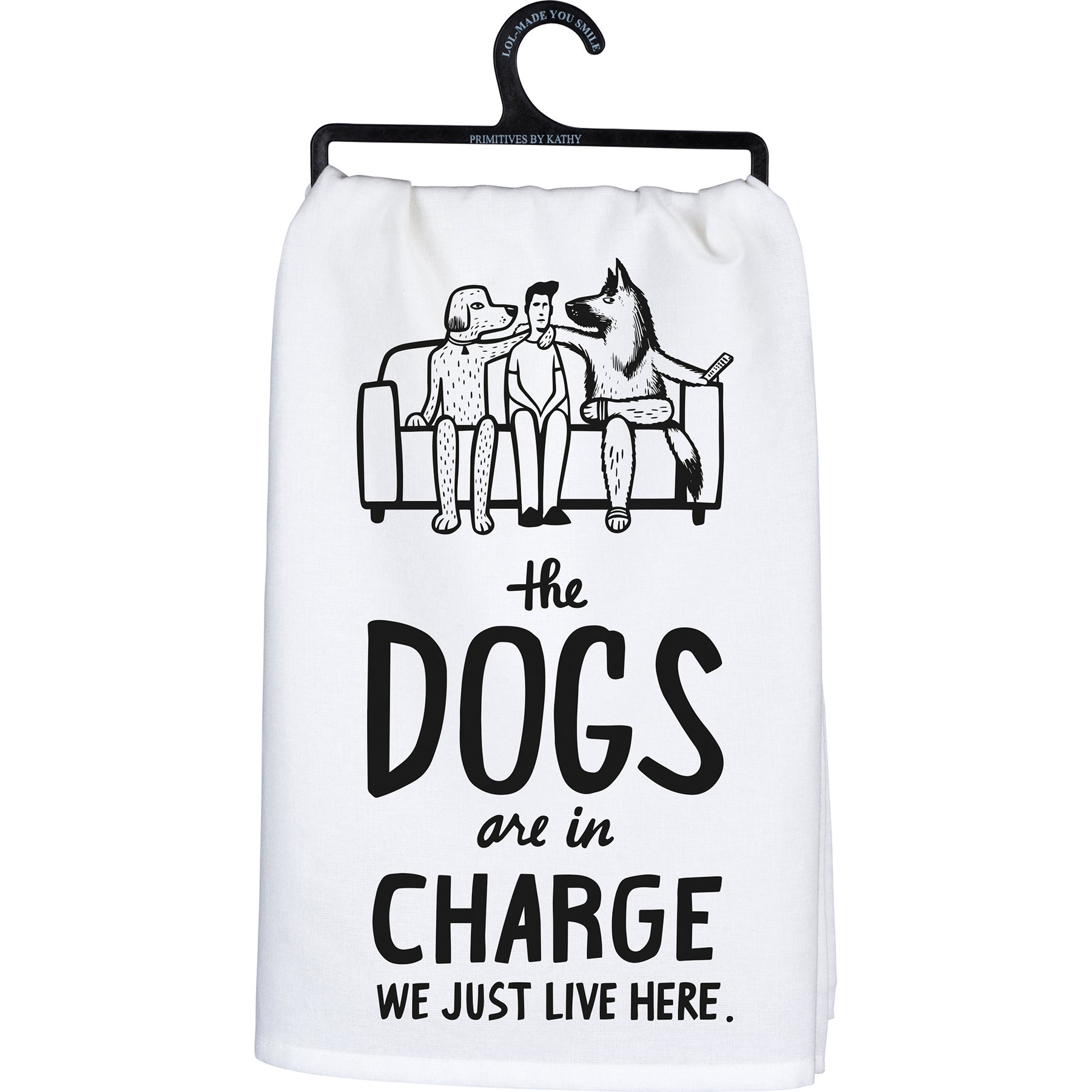 A black and white cotton kitchen towel featuring a "The Dogs Are In Charge We Just Live Here." sentiment with dog design. Machine-washable.