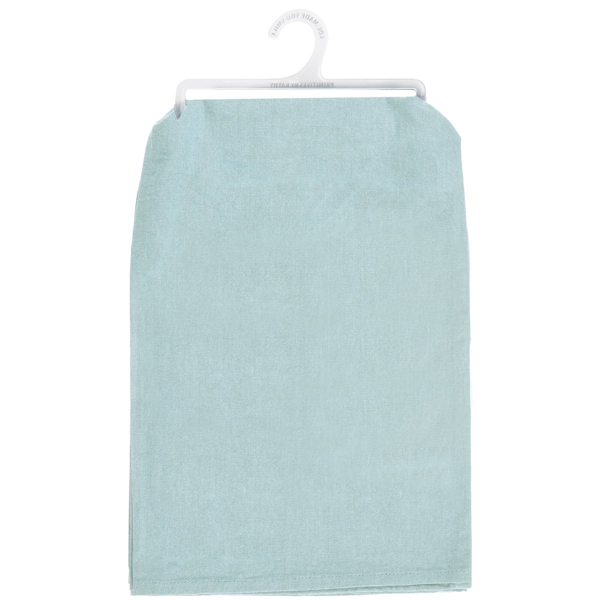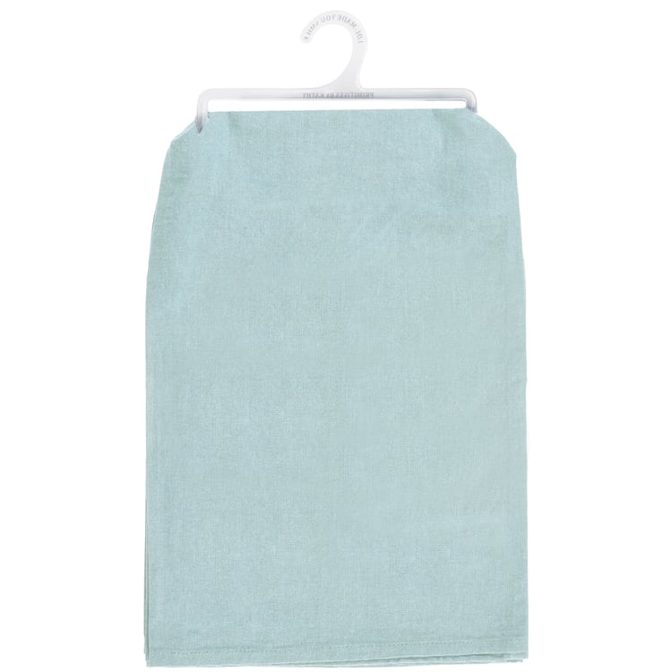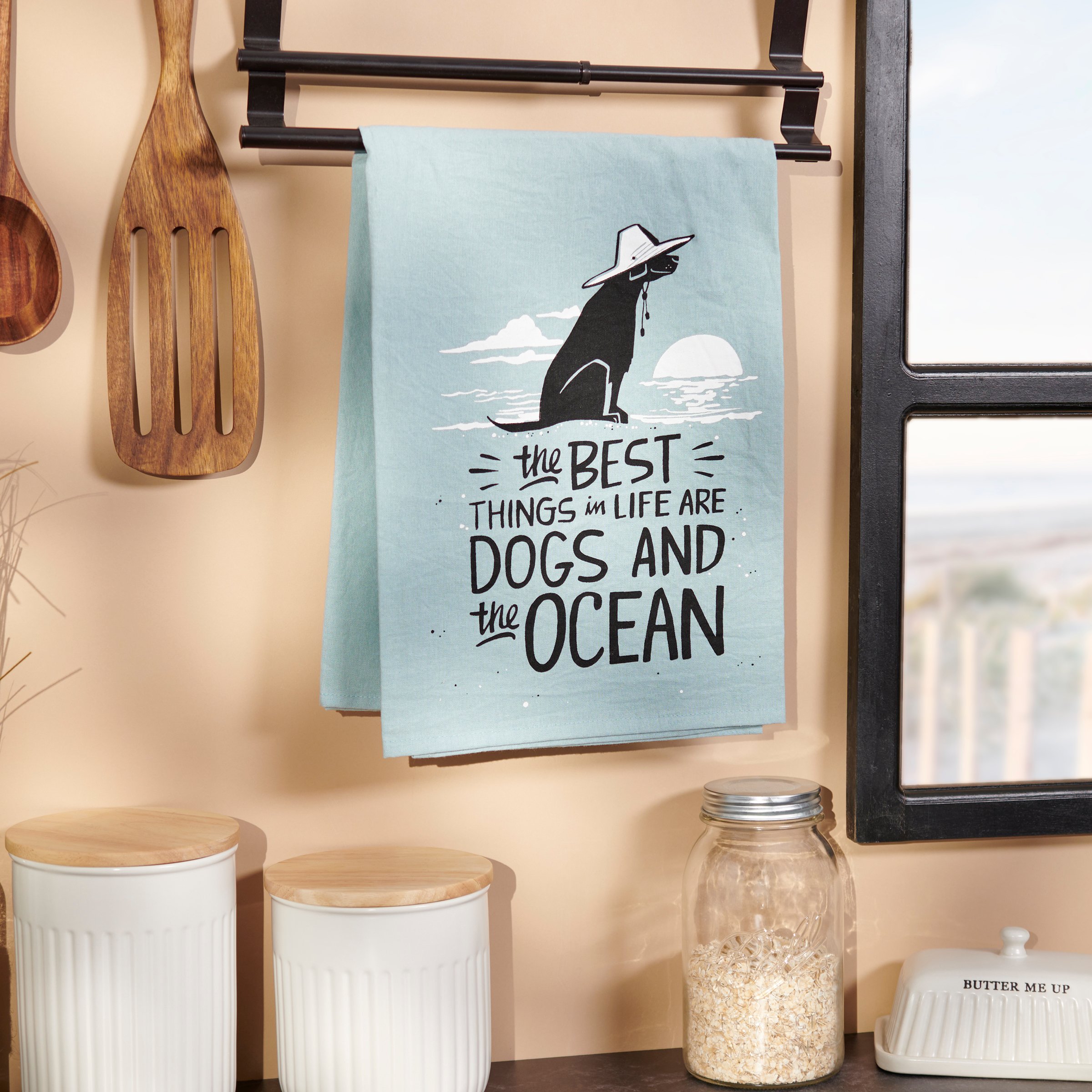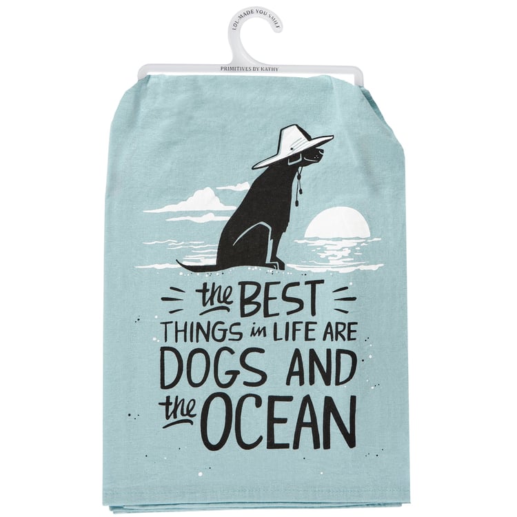 An ocean blue cotton kitchen towel from our Beach Collection displaying a unique hand illustrated design of a dog sitting on the beach wearing a sun hat above a fun beach-themed sentiment that reads "The Best Things In Life Are Dogs And The Ocean." Our Dogs And The Ocean kitchen towel is machine-washable for convenient cleaning. Packaged on a clear plastic hanger to easily display on rack. A fun beach-themed kitchen accessory perfect for everyday use.