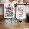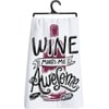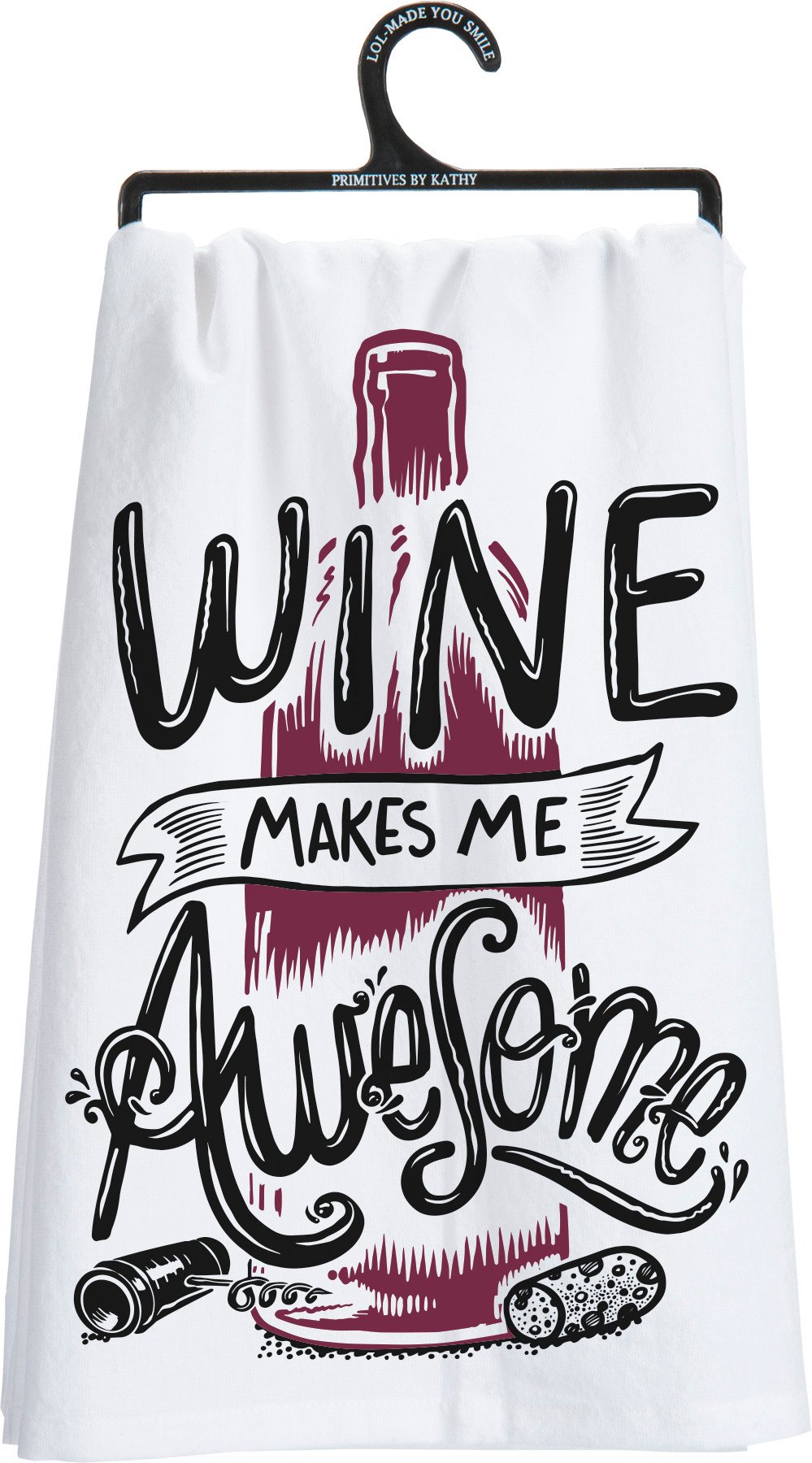 A cotton kitchen towel lending "Wine Makes Me Awesome" hand lettered sentiment with wine bottle, cork, and opener designs. Great for gifting to make for special kitchen decor. Machine-washable.