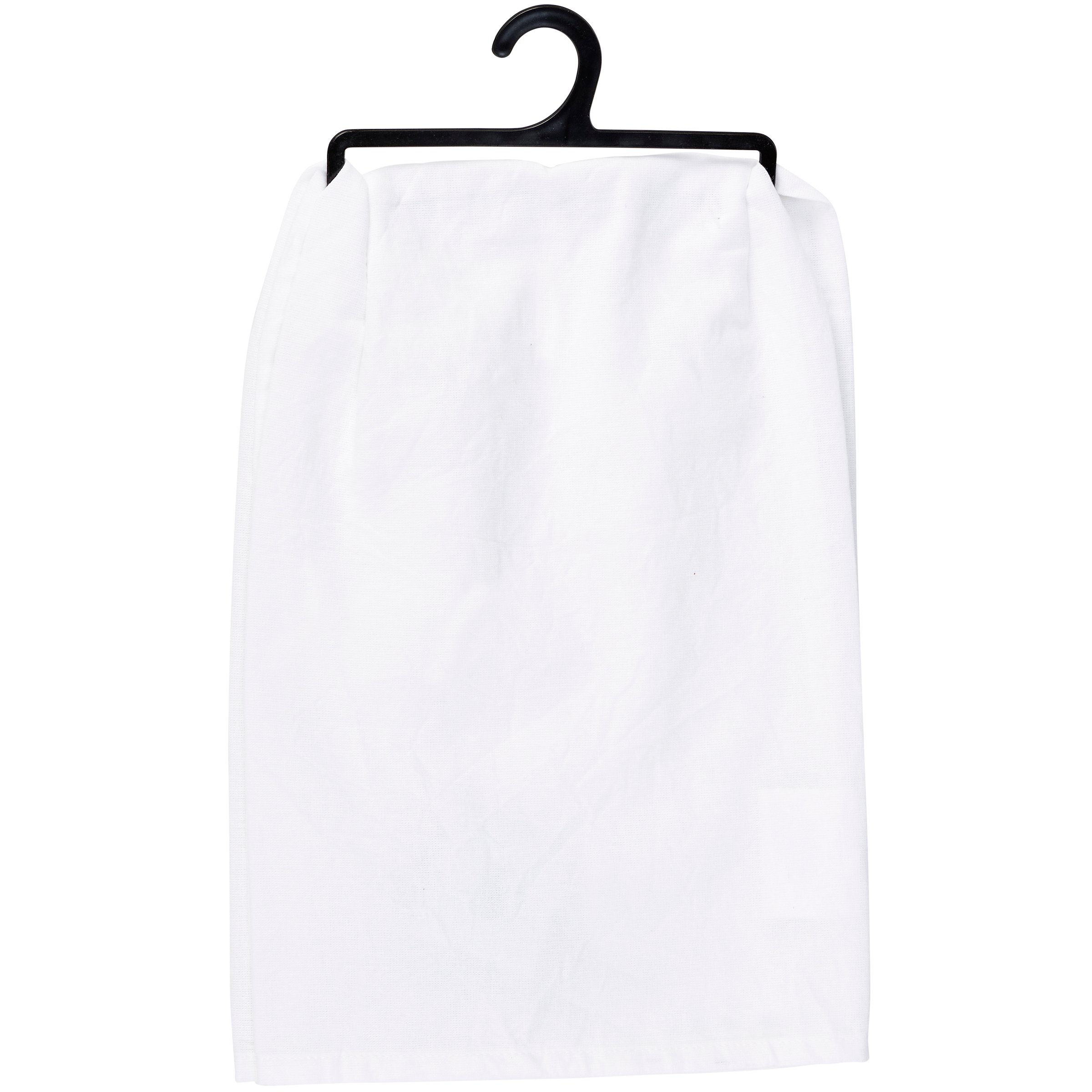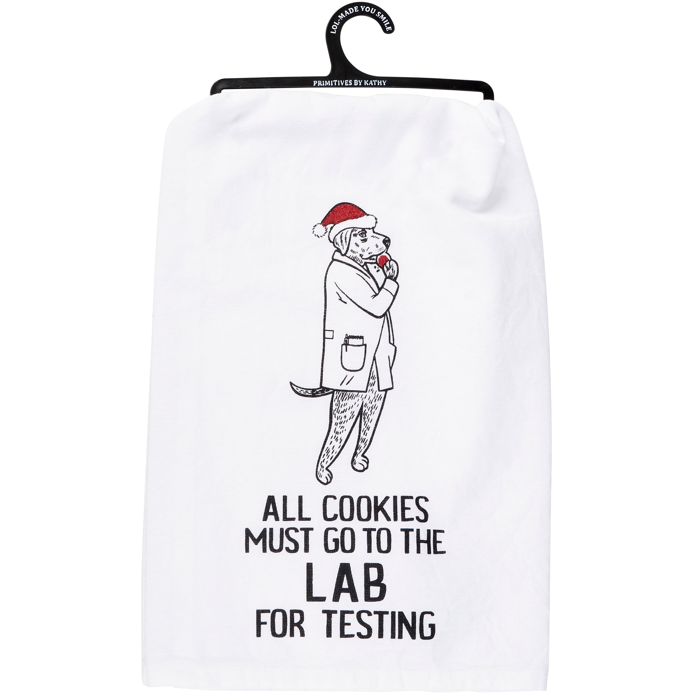 A white cotton kitchen towel from our Holiday Pet Collection/ displaying a unique hand illustrated design of a dog wearing a lab coat and a Santa hat while eating a Christmas cookie above a humorous pet-themed sentiment that reads "All Cookies Must Go To The Lab For Testing." Design features red glitter details. Our To The Lab kitchen towel is conveniently machine-washable for easy cleaning and glitter will not transfer. Seasonal kitchen towel is packaged on a black plastic hanger to easily display on rack. A fun pet-themed kitchen accessory perfect for seasonal use.