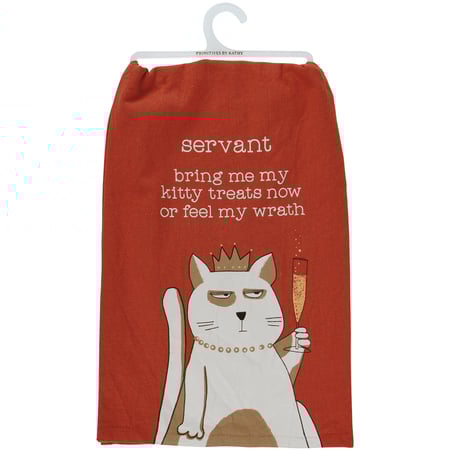 A rustic-inspired cotton kitchen towel from our Pet Collection displaying a sassy cat and champagne design with humorous sentiment that reads "Servant - Bring Me My Kitty Treats Now Or Feel My Wrath." Our Treats Or Feel My Wrath kitchen towel is machine-washable for convenient cleaning. Packaged on a clear plastic hanger to easily display on rack. A fun and functional everyday kitchen accent.