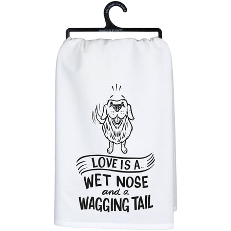 A black and white cotton kitchen towel from our Pet Collection displaying a fun hand illustrated design of a dog looking up with a pet-themed sentiment that reads "Love Is A Wet Nose And A Wagging Tail." Our Wagging Tail kitchen towel is conveniently machine-washable for easy cleaning. Packaged on a black plastic hanger to easily display on rack. A fun pet-themed kitchen accessory perfect for everyday use.
