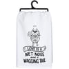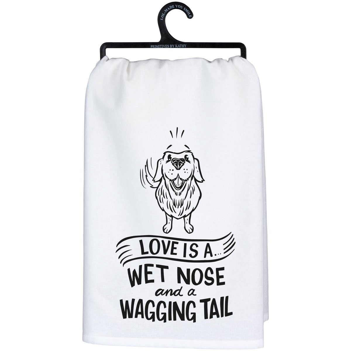 A black and white cotton kitchen towel from our Pet Collection displaying a fun hand illustrated design of a dog looking up with a pet-themed sentiment that reads "Love Is A Wet Nose And A Wagging Tail." Our Wagging Tail kitchen towel is conveniently machine-washable for easy cleaning. Packaged on a black plastic hanger to easily display on rack. A fun pet-themed kitchen accessory perfect for everyday use.