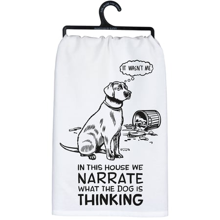 A black and white cotton kitchen towel from our Pet Collection displaying a fun hand illustrated design of a dog next to a spilled garbage can thinking "It Wasn't Me" with a humorous dog-themed sentiment that reads "In This House We Narrate What The Dog Is Thinking." Our We Narrate The Dog kitchen towel is conveniently machine-washable for easy cleaning. Funny kitchen towel is packaged on a black plastic hanger to easily display on rack. A fun pet-themed gift perfect for an everyday kitchen accessory.