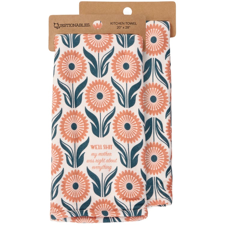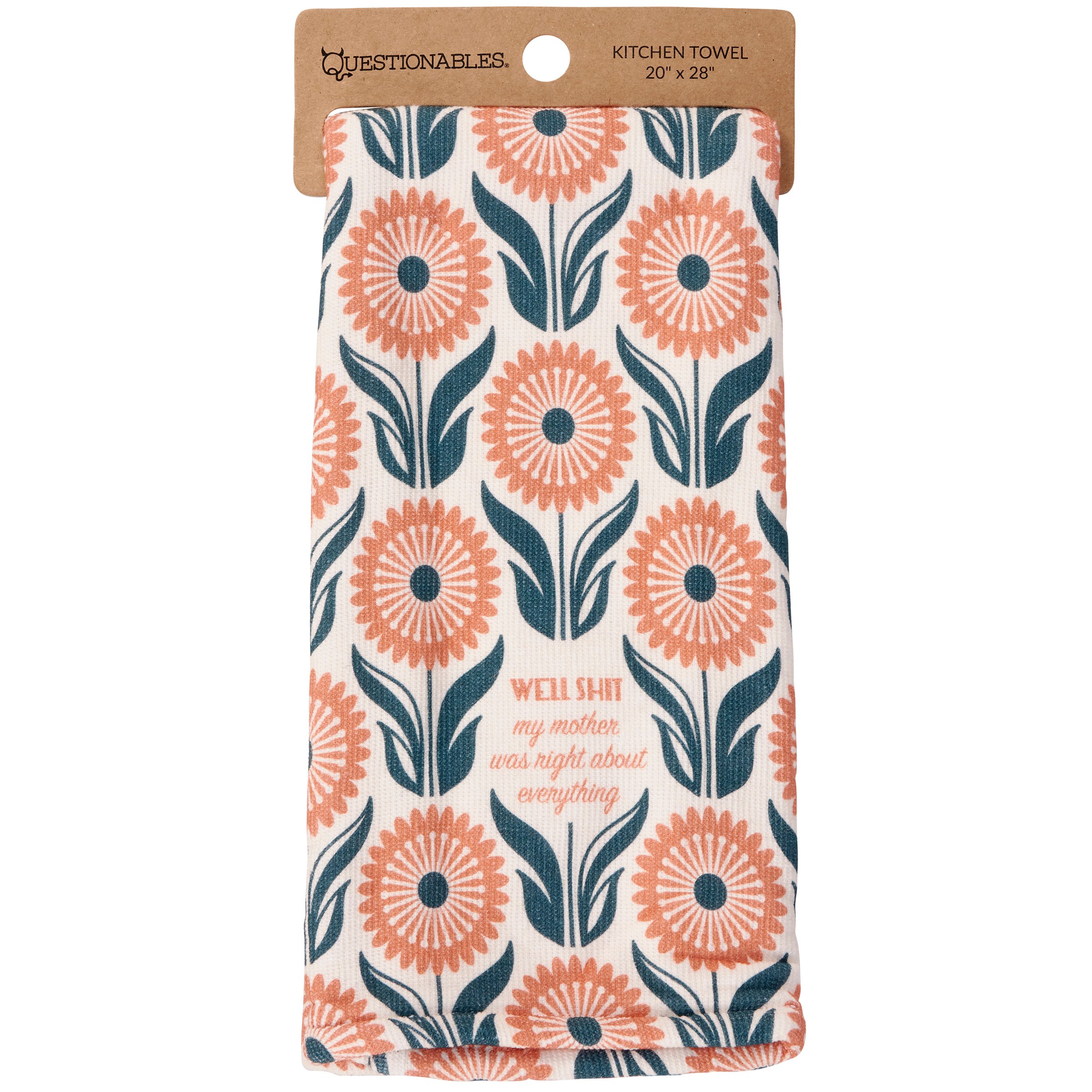 This super-soft cotton kitchen towel flaunts a stylish floral pattern with a sassy sentiment that reads "Well Shit - My Mother Was Right About Everything." Fold to display the flower pattern for when you want to hide that realization from mom or flip to display the relatable sentiment for everyone else. Questionables kitchen towel features an absorbent terrycloth layer on the back to soak up whatever you throw at it. Machine-washable for stress-free cleaning. Packaged on a cardboard hanger with a hole to beautifully display on rack. Our Well My Mother kitchen towel demands attention and is perfect for everyday expression or gifting to like-minded friends.