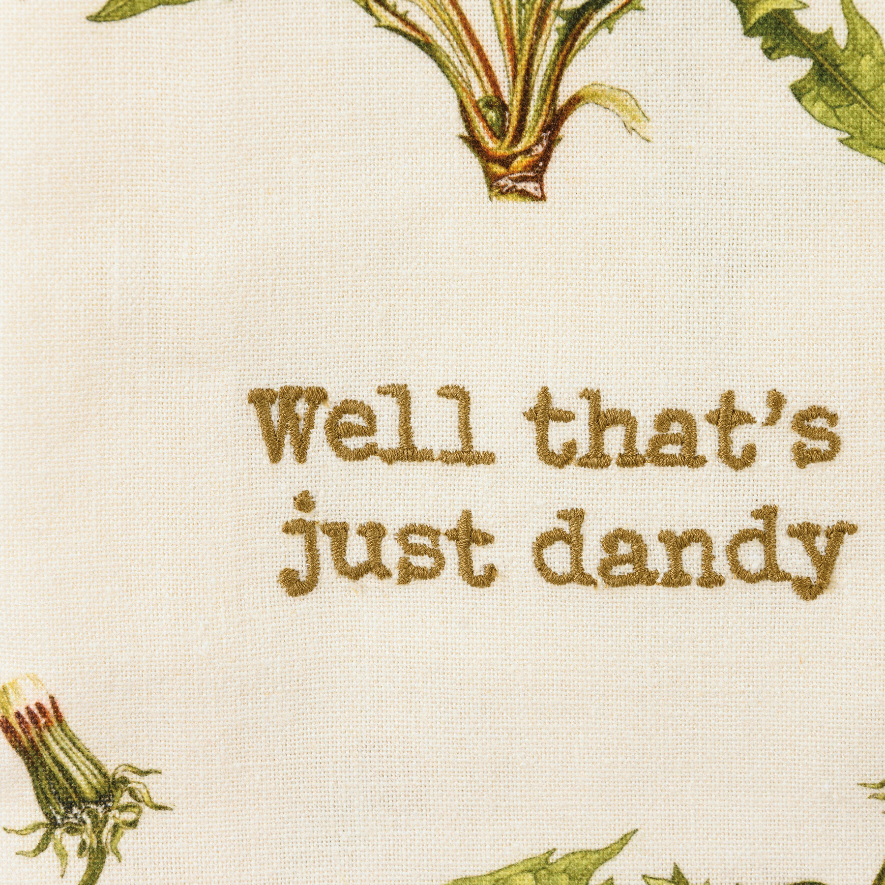 A cotton linen blend kitchen towel from our Garden Collection featuring all-over vintage style dandelion designs and punny embroidered "Well That's Just Dandy" sentiment. Features a cotton tape loop in the corner for easy hanging. Our Dandelion kitchen towel is machine-washable. Towel is packaged on a cardboard hanger with a hole to easily hang on rack.