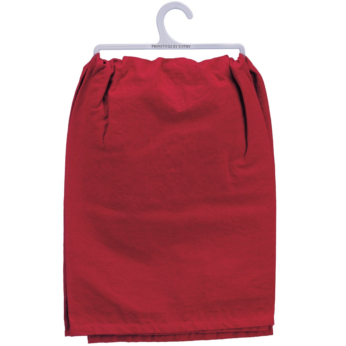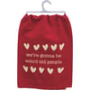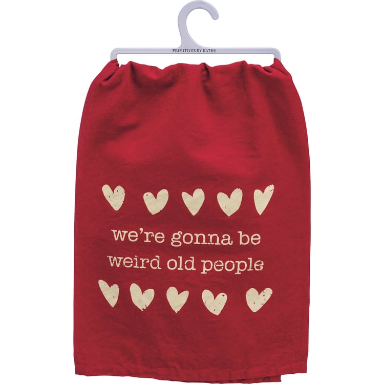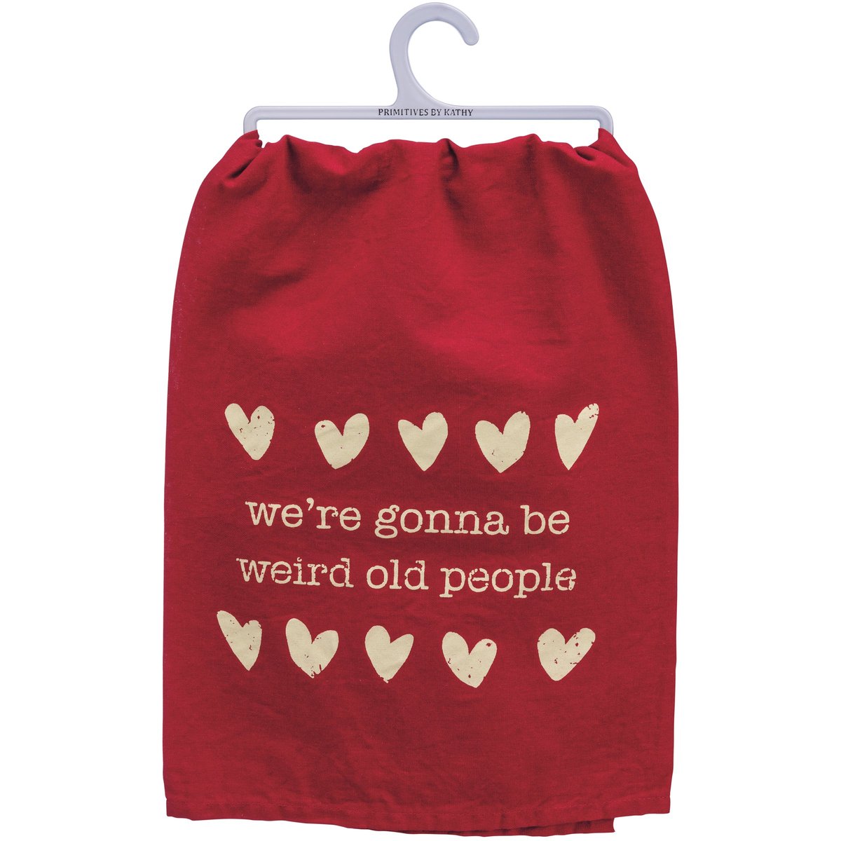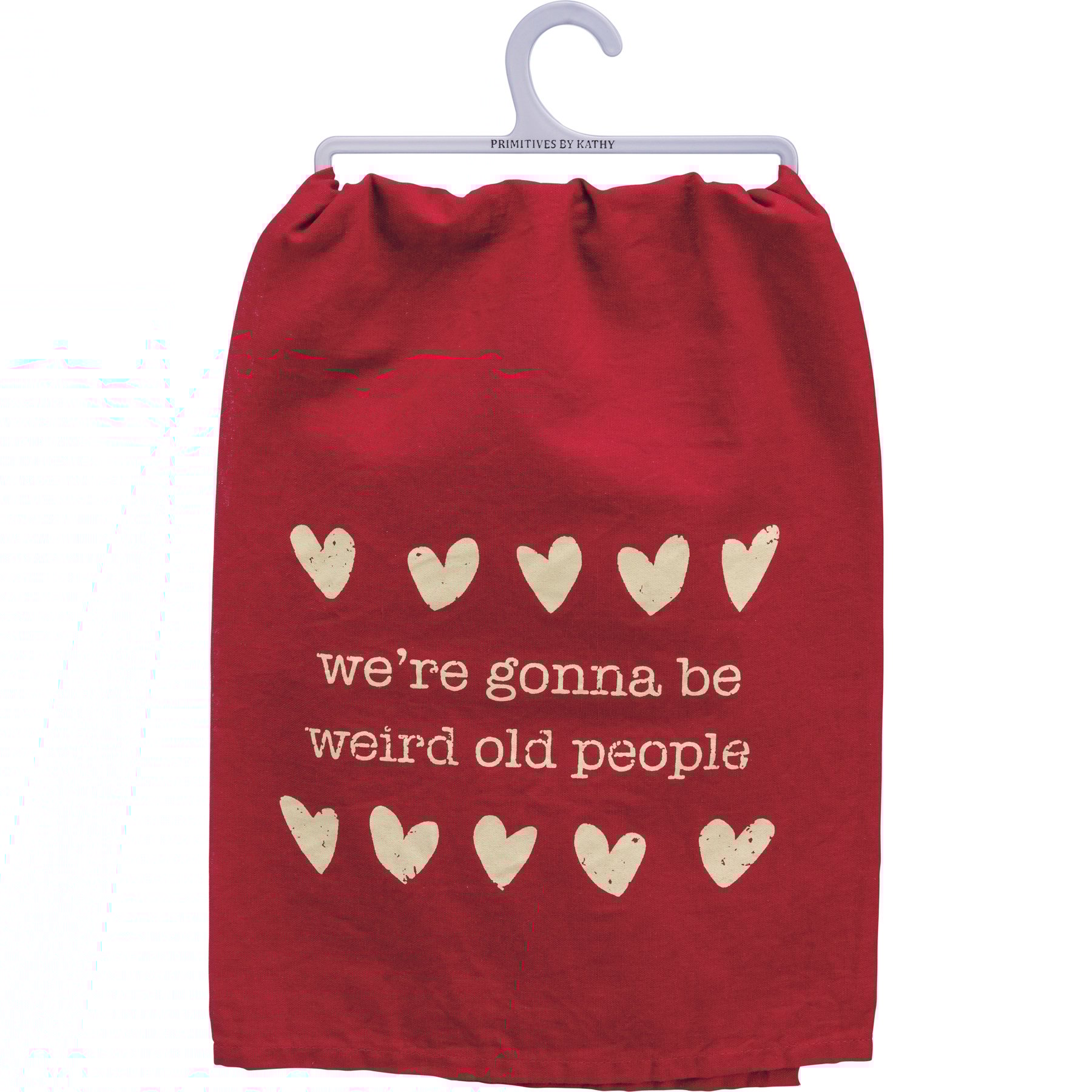 A rustic-inspired cotton kitchen towel featuring a distressed "We're Gonna Be Weird Old People" sentiment with heart designs. Machine-washable.