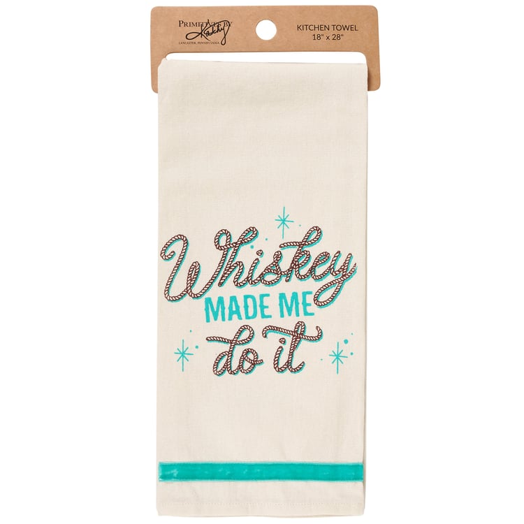 A cotton kitchen towel from our Western Collection displaying a hand illustrated design of a fun western inspired sentiment that reads "Whiskey Made Me Do It." Western kitchen towel features a coordinating turquoise velvet ribbon along one edge. Our Whiskey Made Me kitchen towel is conveniently machine-washable for easy cleaning. Western towel is packaged on a cardboard hanger with hole to easily display on rack. A western-themed kitchen accessory perfect for everyday use.