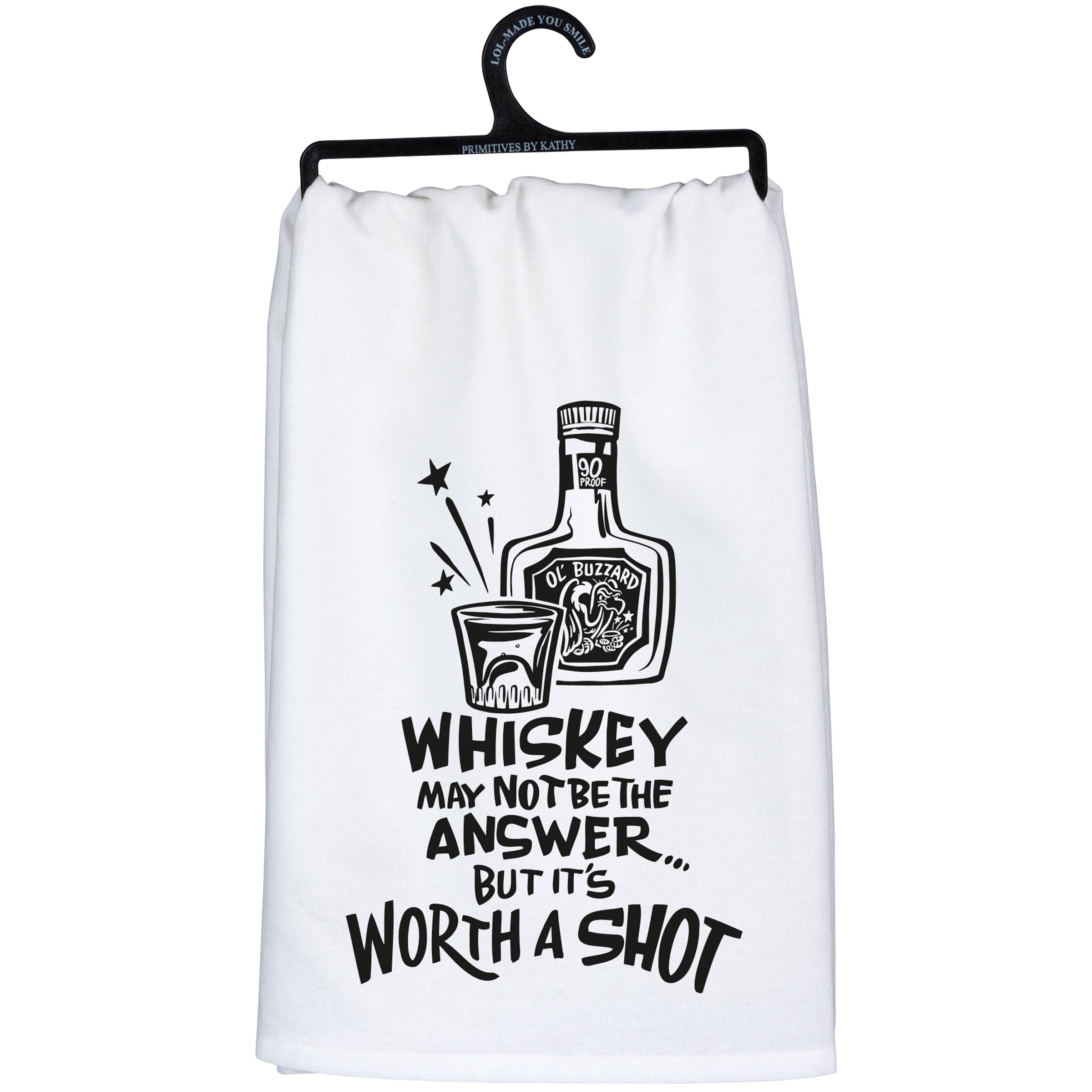 A black and white cotton kitchen towel from our LOL-Made You Smile Collection displaying a playful hand illustrated design of a whiskey bottle and shot glass with a sarcastic alcohol inspired sentiment that reads "Whiskey May Not Be The Answer... But It's Worth A Shot." Our Whiskey Worth A Shot kitchen towel is conveniently machine-washable for easy cleaning. This funny alcohol kitchen towel is packaged on a black plastic hanger to easily display on rack. A fun alcohol-themed gift perfect for adding personality to any kitchen.