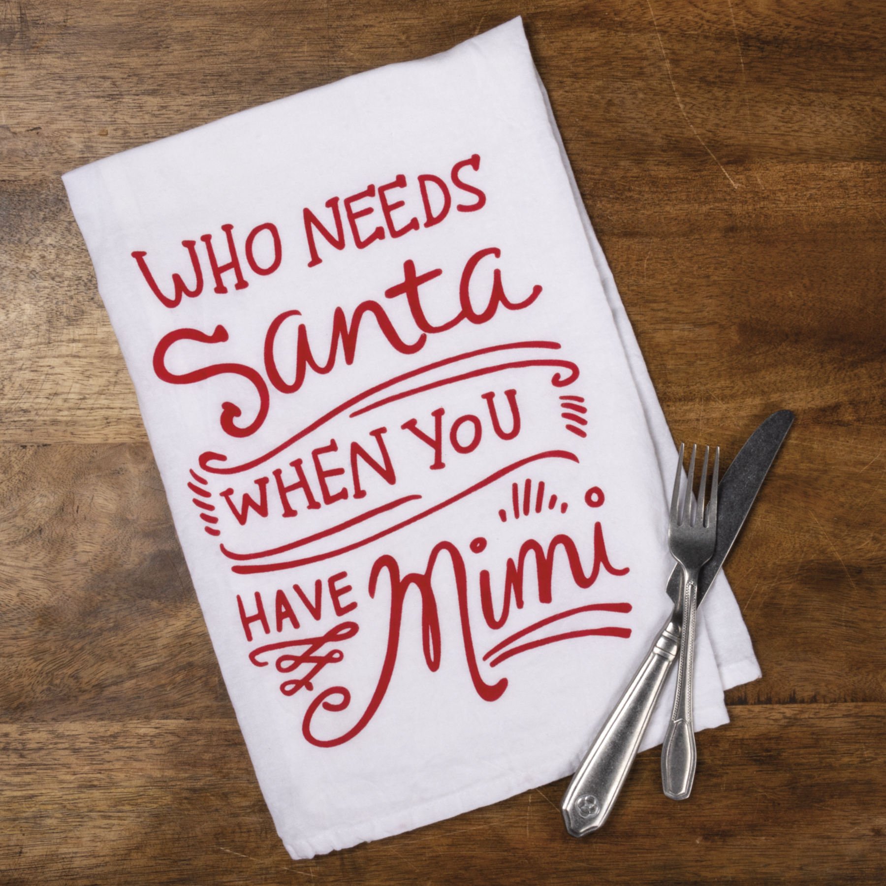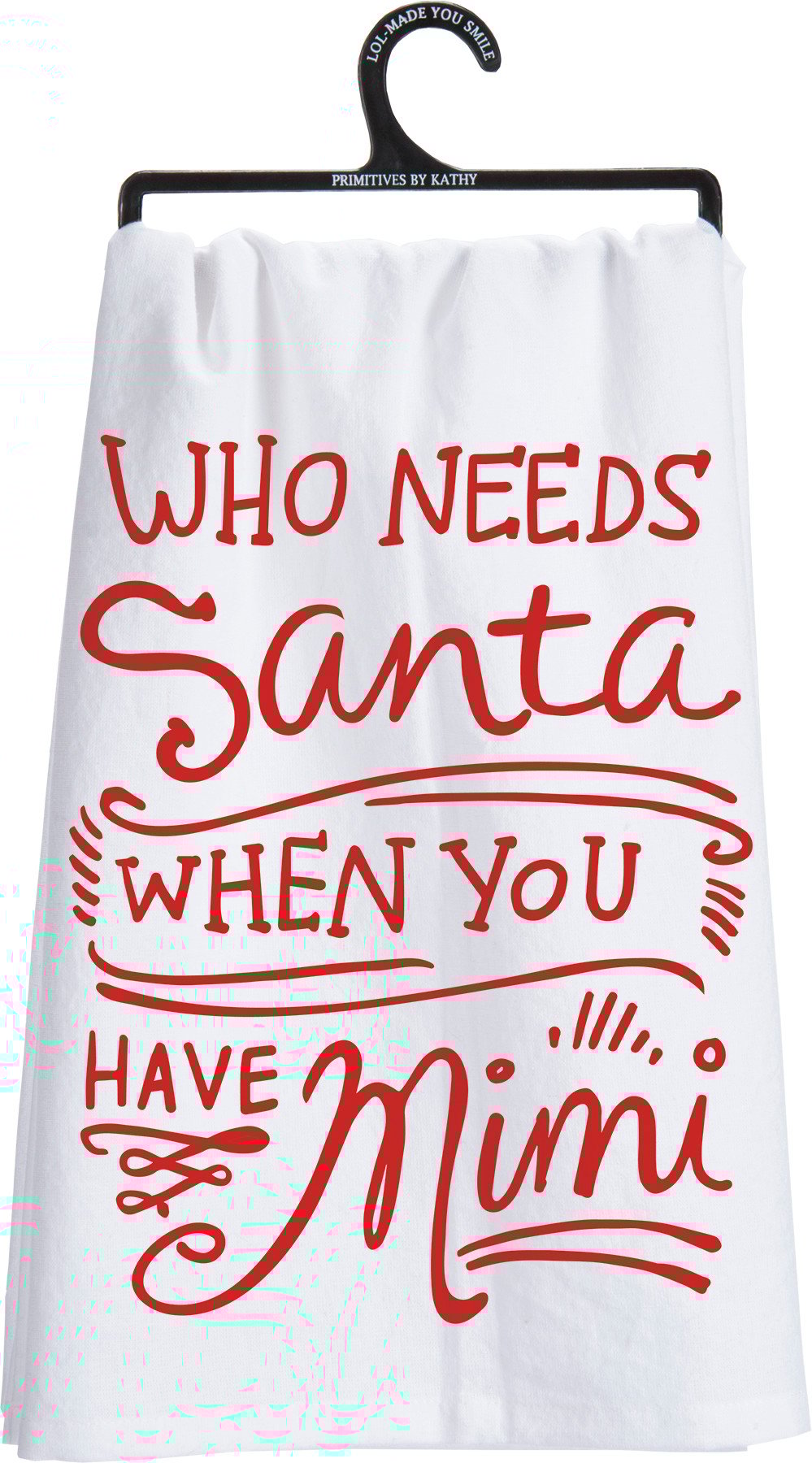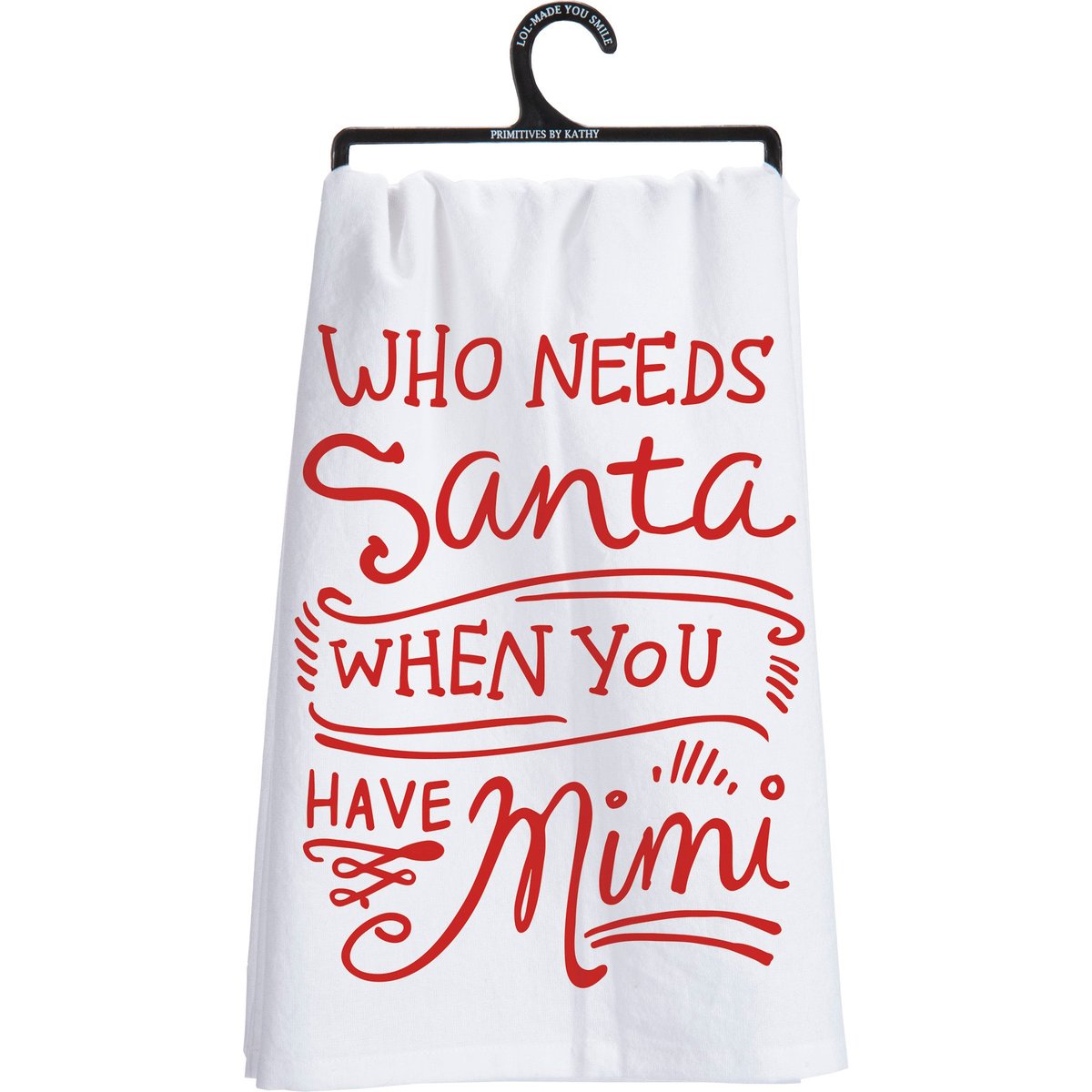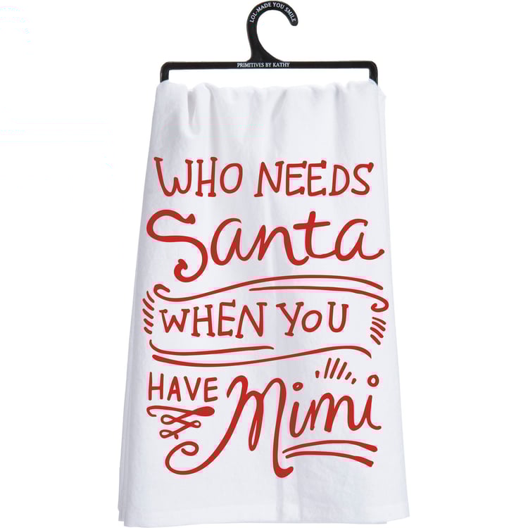 A red and white cotton kitchen towel lending a hand lettered "Who Needs Santa When You Have Mimi" sentiment. Complements well with existing kitchen decor; machine-washable.
