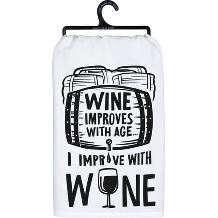 A black and white cotton kitchen towel featuring a "Wine Improves With Age… I Improve With Wine" sentiment with barrel and wine glass designs. Complements well with existing kitchen decor. Machine-washable.