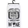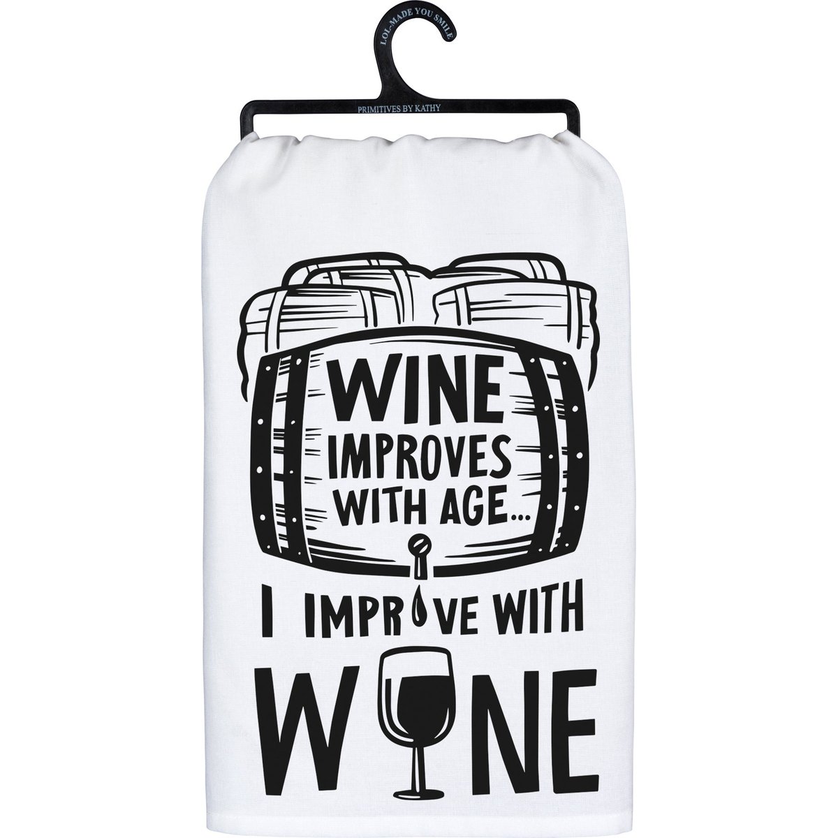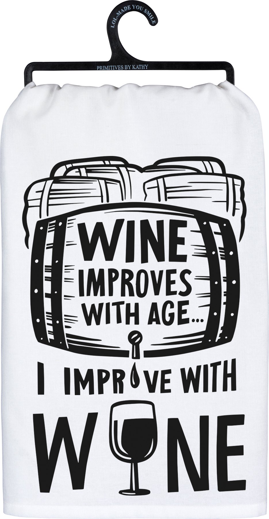 A black and white cotton kitchen towel featuring a "Wine Improves With Age⦠I Improve With Wine" sentiment with barrel and wine glass designs. Complements well with existing kitchen decor. Machine-washable.