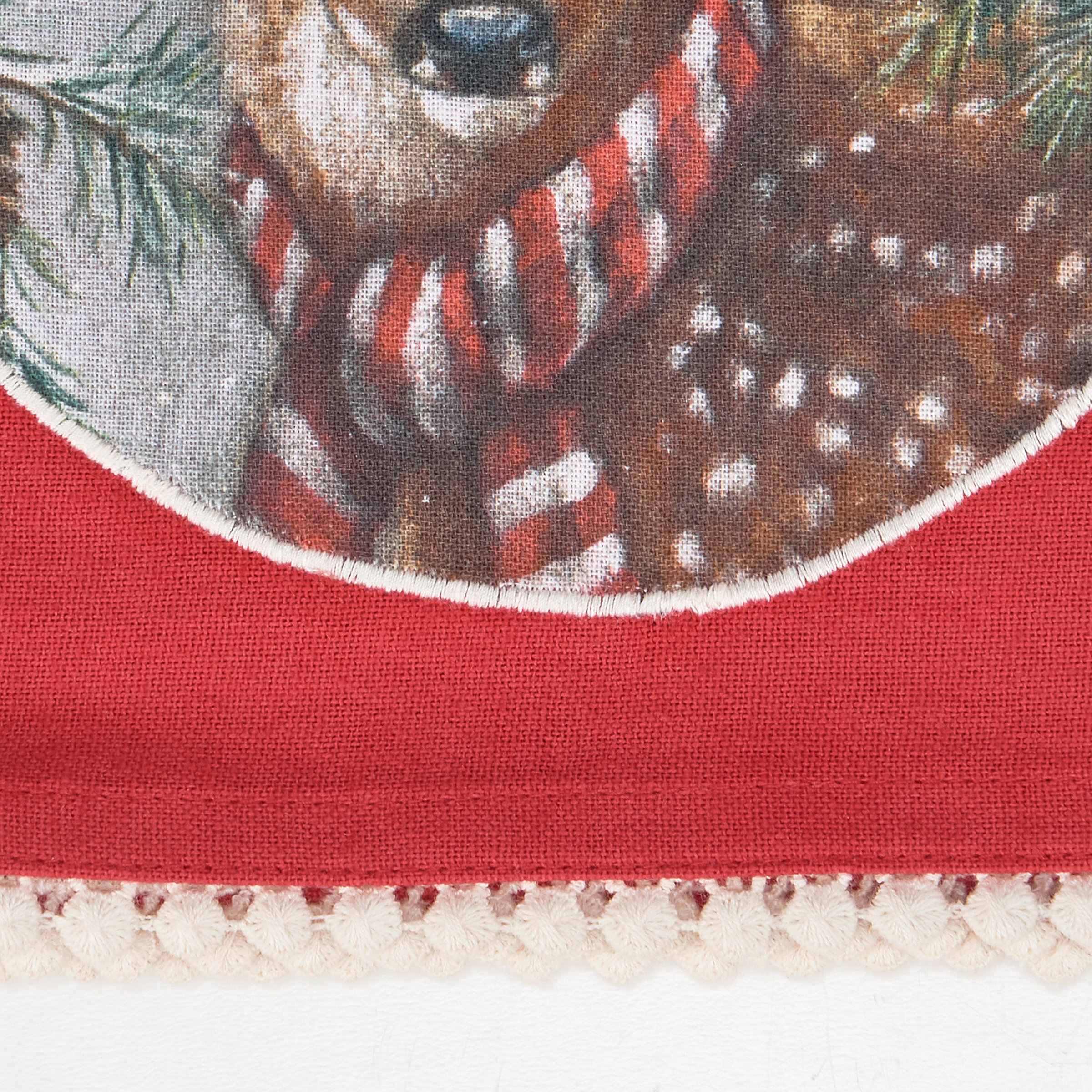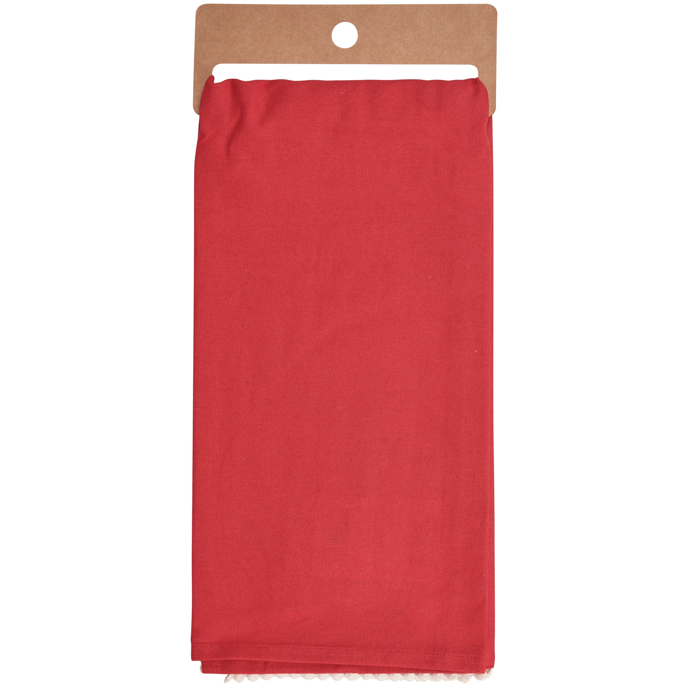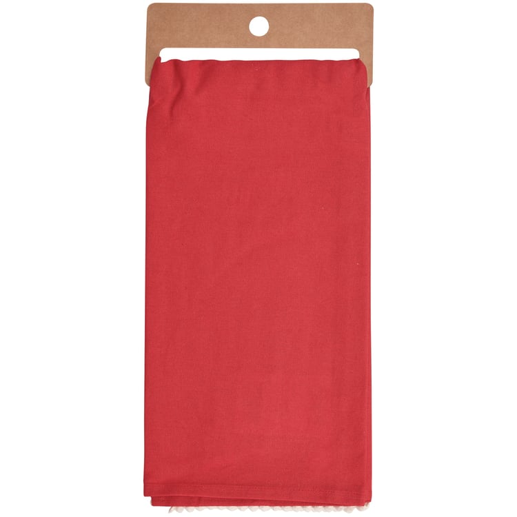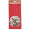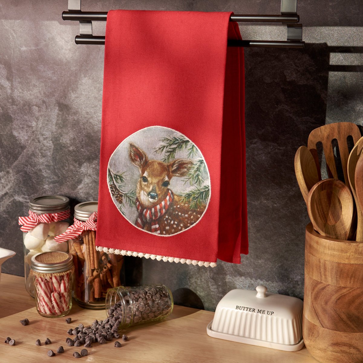 A red cotton kitchen towel from our Christmas Collection featuring a stitched art panel and white pom trim. Art panel displays a hand painted winter scene of a deer wearing a holiday scarf. Design is replicated from original artwork painted onto burlap canvas, giving the art a unique depth and texture. Our Winter Deer kitchen towel is conveniently machine-washable for easy cleaning. Seasonal kitchen towel is packaged on a cardboard hanger with hole to easily hang on rack. A rustic winter-themed kitchen accessory perfect for seasonal use.