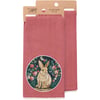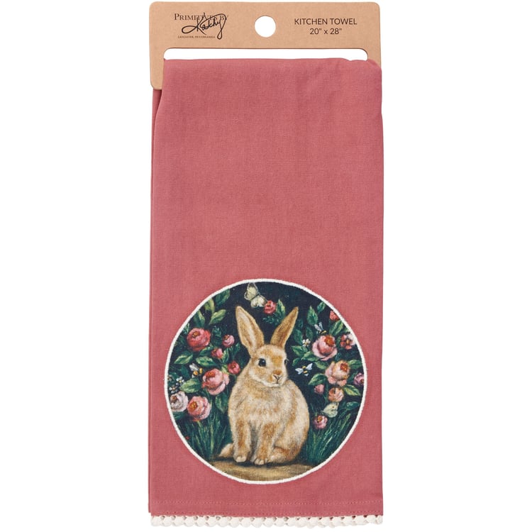 A pink cotton kitchen towel from our Easter & Spring Collection featuring a stitched art panel and white pom trim. Art panel displays a hand painted design of a woodland bunny surrounded by spring flowers in a moody color palette. Design is replicated from original artwork painted onto burlap canvas, giving the art a unique depth and texture. Our Woodland Bunny kitchen towel is machine-washable for convenient cleaning. Packaged on a cardboard hanger with hole to easily hang on rack. A charming spring-themed kitchen accessory perfect for seasonal use.