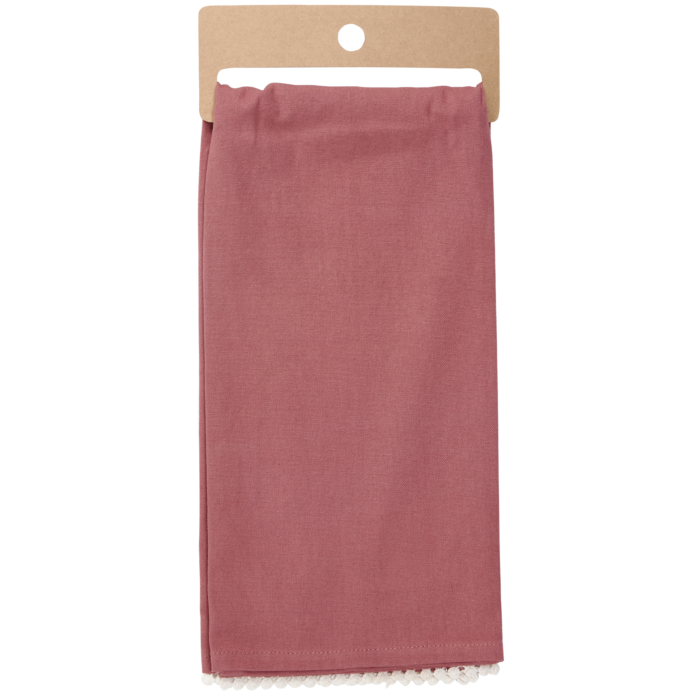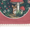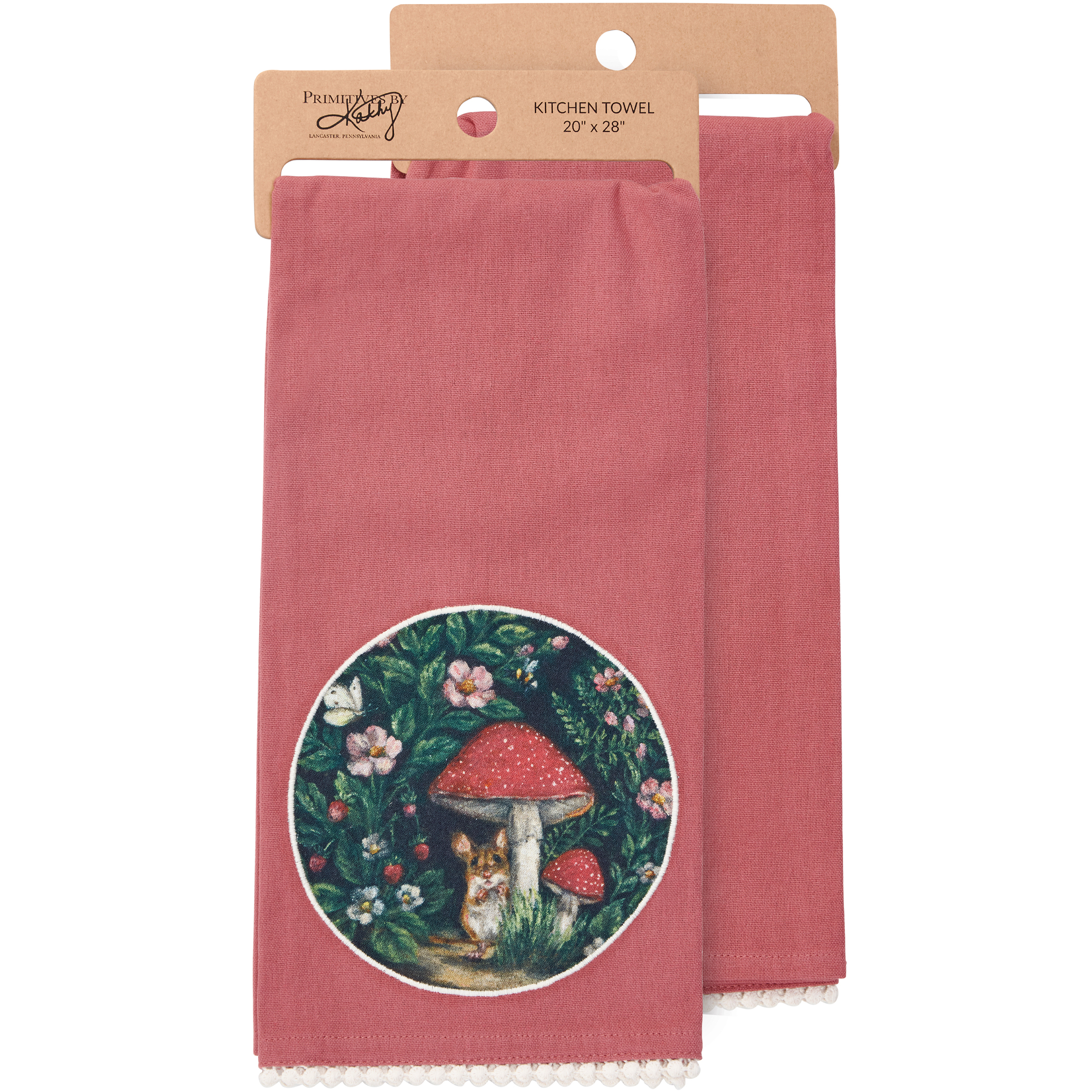 A pink cotton kitchen towel from our Easter & Spring Collection featuring a stitched art panel and white pom trim. Art panel displays a hand painted design of a woodland mouse under mushrooms and surrounded by spring flowers in a moody color palette. Design is replicated from original artwork painted onto burlap canvas, giving the art a unique depth and texture. Our Woodland Mouse kitchen towel is machine-washable for convenient cleaning. Packaged on a cardboard hanger with hole to easily hang on rack. A charming spring-themed kitchen accessory perfect for seasonal use.