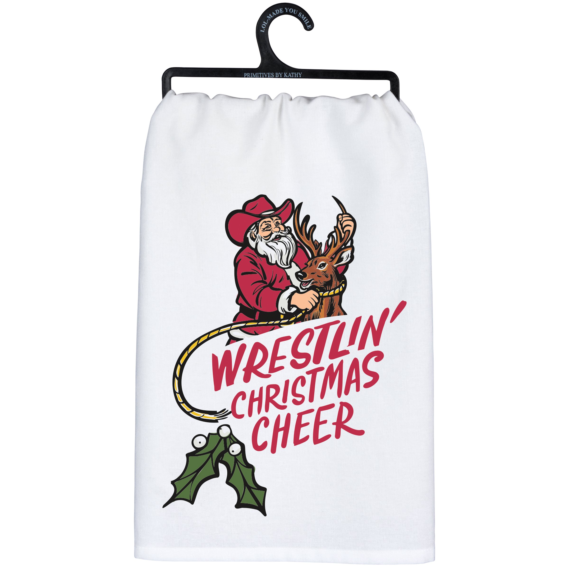 A white cotton kitchen towel from our Christmas Collection displaying a colorful hand illustrated design of Santa wearing a western style outfit and wrangling a reindeer with a fun western-themed Christmas sentiment that reads "Wrestlin' Christmas Cheer." Our Wrestlin' Christmas Cheer kitchen towel is conveniently machine-washable for easy cleaning. Seasonal kitchen towel is packaged on a black plastic hanger to easily display on rack. A fun western-themed Christmas gift perfect for adding personality to any kitchen while holiday decorating.