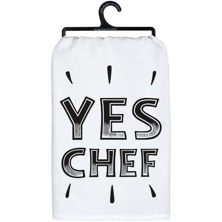 A black and white cotton kitchen towel from our LOL-Made You Smile Collection displaying a fun hand illustrated design of a humorous cooking inspired sentiment that reads "YES CHEF" Our Yes Chef kitchen towel is conveniently machine-washable for easy cleaning. Funny kitchen towel is packaged on a black plastic hanger to easily display on rack. A fun cooking-themed gift perfect for an everyday kitchen accessory.