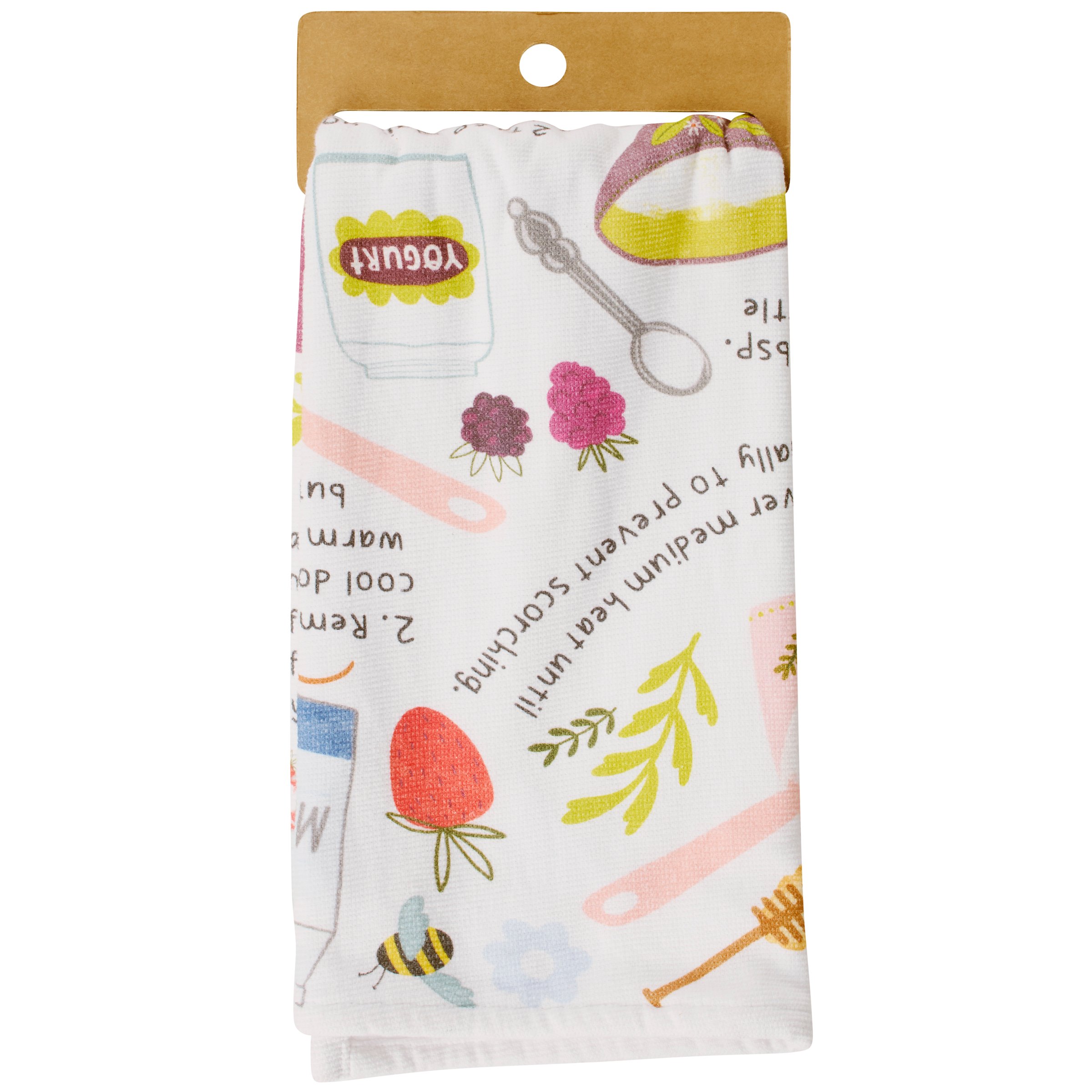 A cotton kitchen towel from our Homestead Collection displaying a fun recipe inspired all-over design replicated from original hand illustrated art. Homestead recipe design features instructions for making homemade yogurt with coordinating illustrations. Yogurt recipe is printed on textured slub fabric with a complementing purple hem stitch at the bottom. Recipe kitchen towel features a terrycloth layer on the back for added absorbency and corner loop for hanging. Our Yogurt Recipe kitchen towel is conveniently machine-washable for easy cleaning. Kitchen towel is packaged on a cardboard hanger with hole to easily display on rack. A fun recipe themed gift perfect for an everyday kitchen accessory.