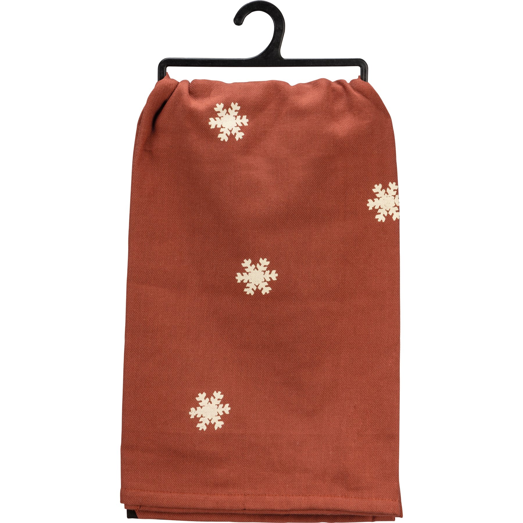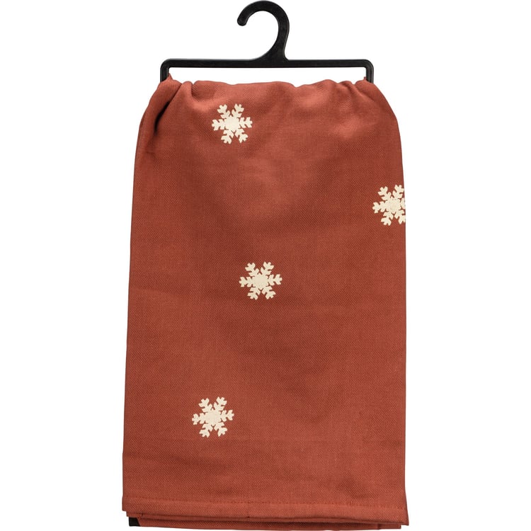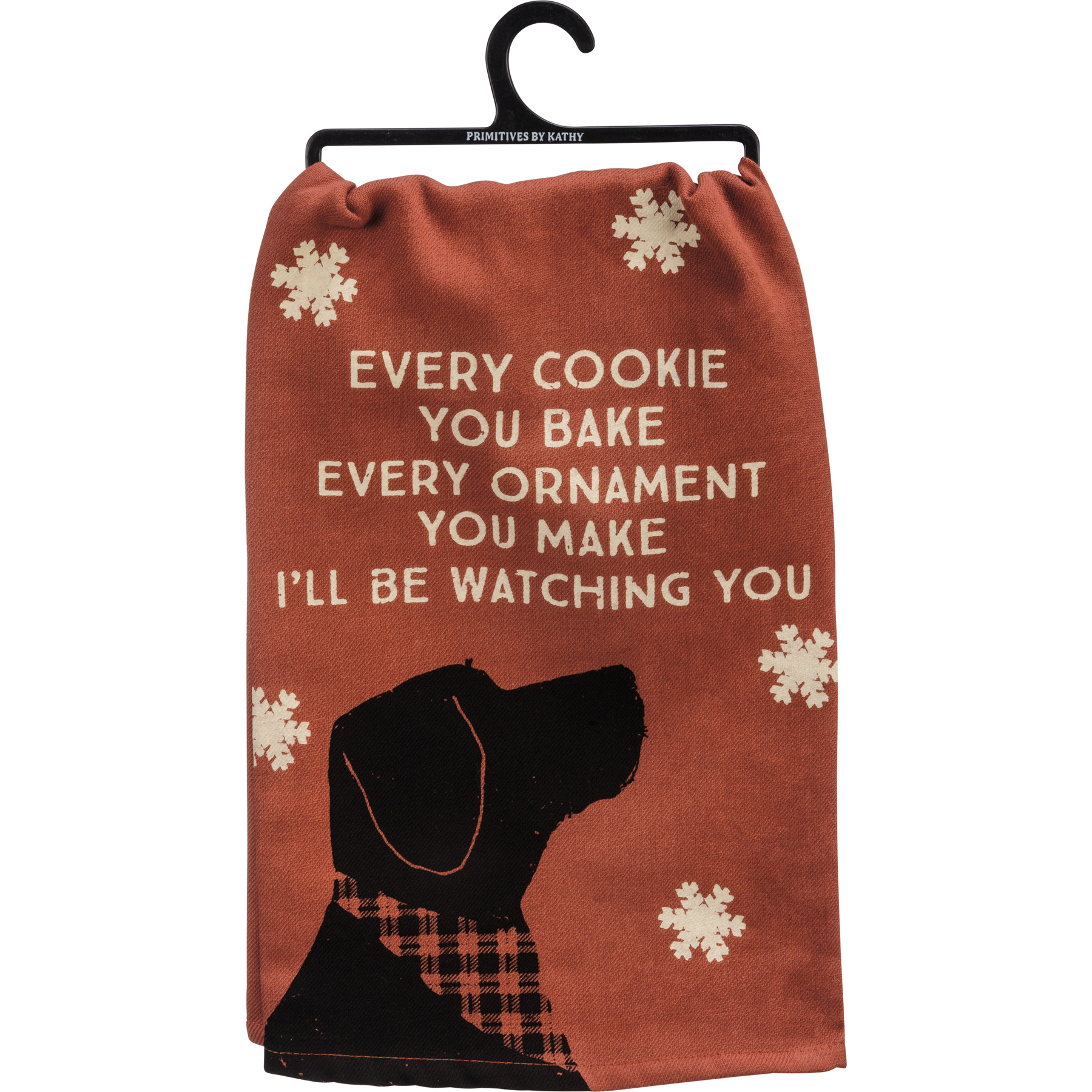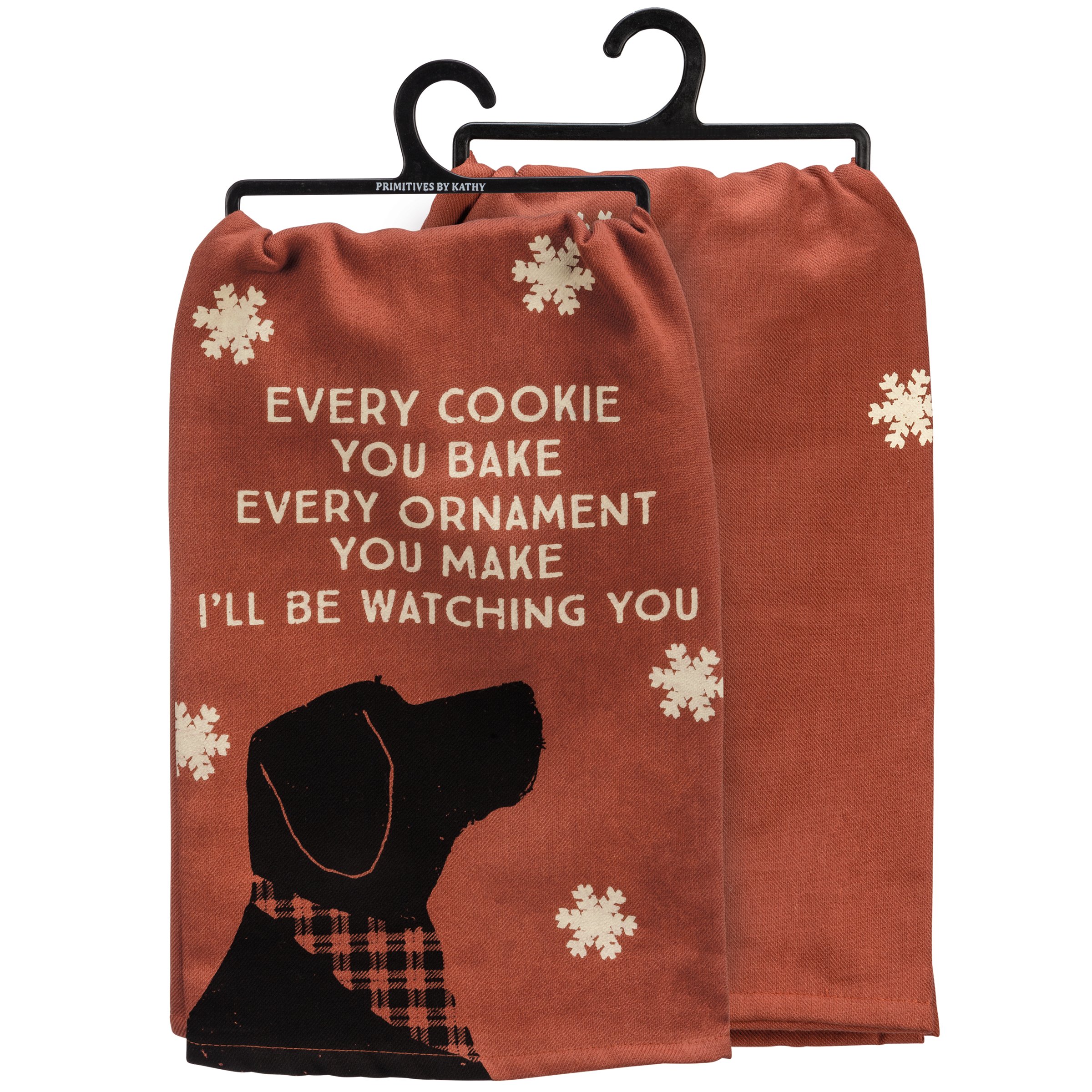 A red cotton kitchen towel displaying a rustic design of a dog wearing a bandana with snowflakes and a fun pet-themed sentiment that reads "Every Cookie You Bake Every Ornament You Make I'll Be Watching You." Our I'll Be Watching You Dog kitchen towel is conveniently machine-washable for easy cleaning. Seasonal kitchen towel is packaged on a black plastic hanger to easily display on rack. A fun pet-themed kitchen accessory perfect for seasonal use.