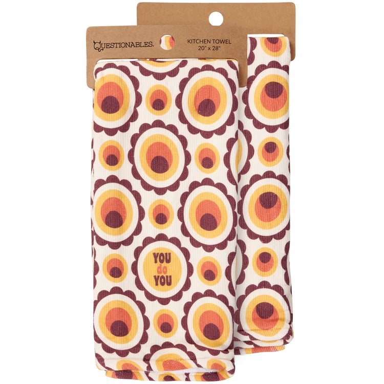 Don't bother asking me, I don't care. Instead, read this super-soft cotton kitchen towel flaunting a stylish retro inspired pattern with a sassy sentiment that reads "You Do You." Fold to display the retro pattern vibe or flip to display the relatable sentiment for all to read. Questionables kitchen towel features an absorbent terrycloth layer on the back to soak up whatever you throw at it. Machine-washable for stress-free cleaning. Packaged on a cardboard hanger with a hole to beautifully display on rack. Our You Do You kitchen towel calls back to a retro style while also calling out a modern mentality, perfect for everyday expression or gifting to like-minded friends.