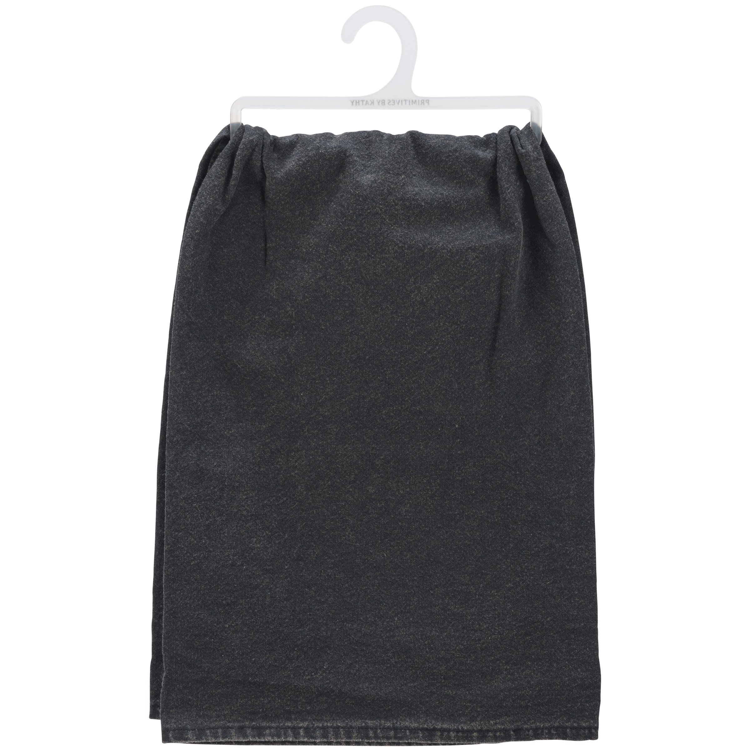 A black cotton kitchen towel featuring a distressed "You Woke Up Sexy As Hell Again - Coffee" sentiment with rustic coffee cup featuring a star design. Our You Woke Up Sexy As Hell Again kitchen towel is machine-washable.