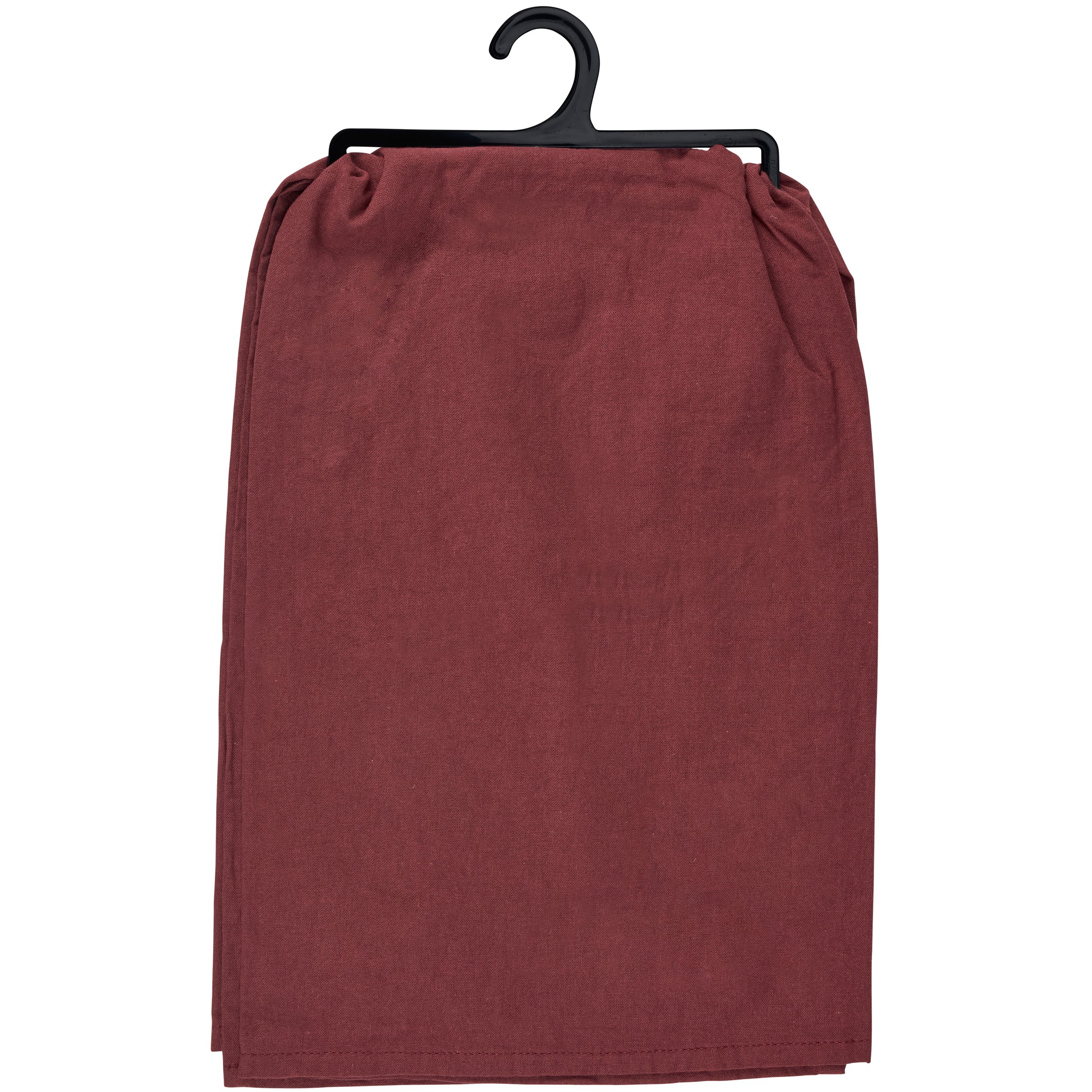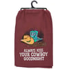 A brown cotton kitchen towel from our Western Collection displaying a western inspired design of a boots, hat and rope in a modern style with fun hand illustrated details and a sentiment that reads "Always Kiss Your Cowboy Goodnight." Our Kiss Your Cowboy kitchen towel is conveniently machine-washable for easy cleaning. Packaged on a black plastic hanger to easily display on rack. A fun western-themed accessory perfect for everyday use.