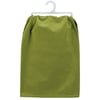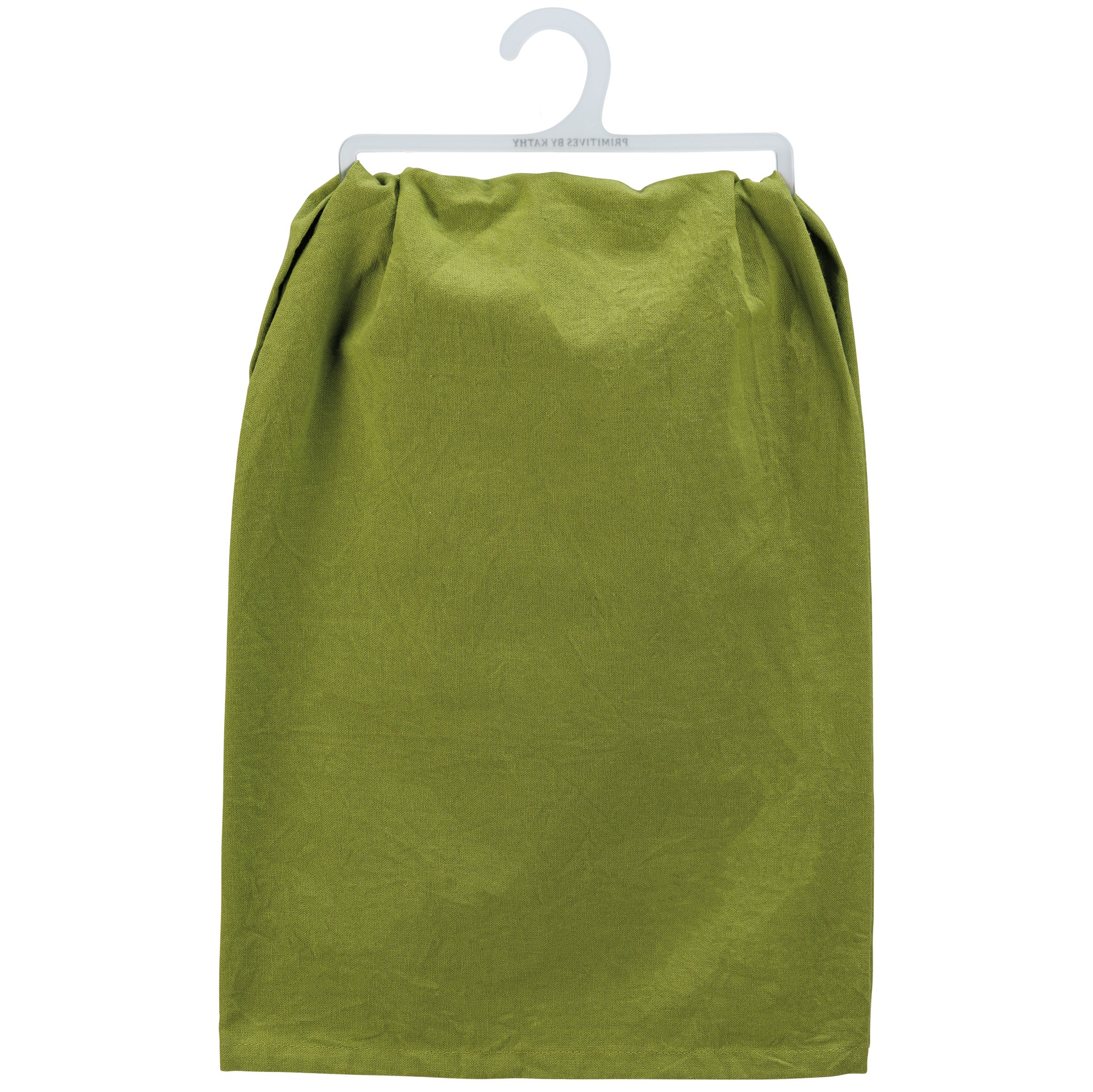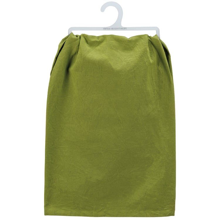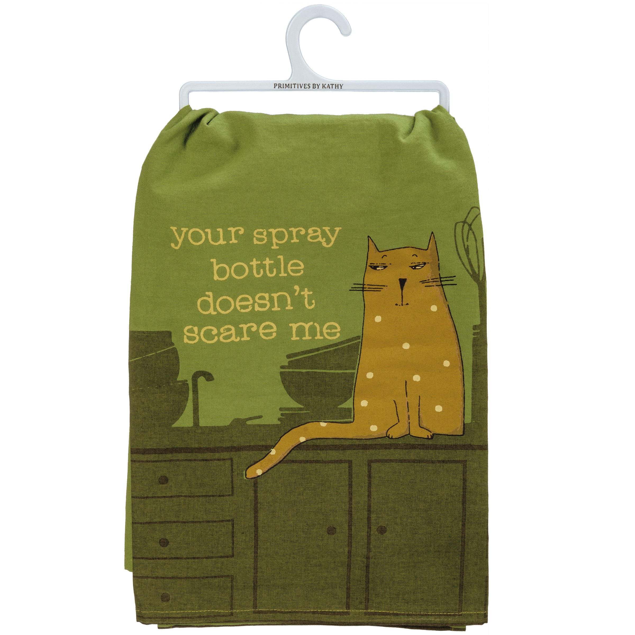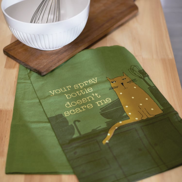 A green cotton kitchen towel displaying a rustic design of a sassy cat sitting on a kitchen counter with a fun cat inspired sentiment that reads "Your Spray Bottle Doesn't Scare Me." Our Spray Bottle kitchen towel is conveniently machine-washable for easy cleaning. Funny kitchen towel is packaged on a clear plastic hanger to easily display on rack. A fun pet-themed kitchen accessory perfect for everyday use.