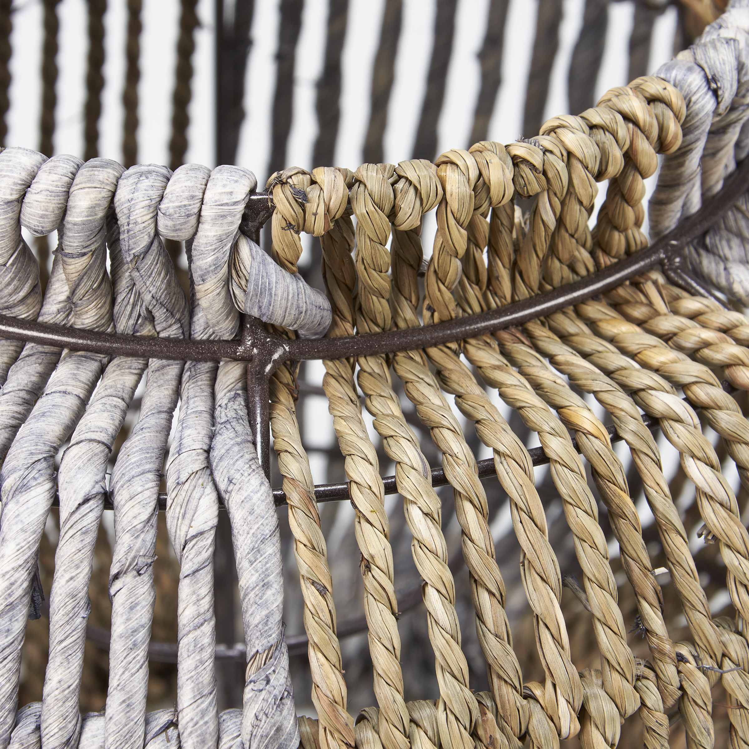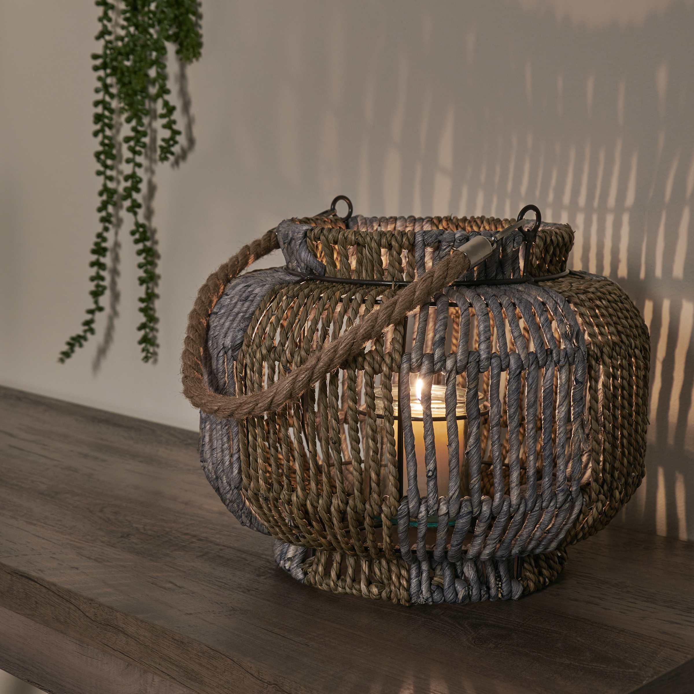 A lantern from our Beach Collection displaying a woven rope design in a neutral color palette. Lantern includes a metal frame for sturdiness with built-in space inside for included removable glass holder to place various light sources through round opening in the top. Candle pictured not included. Our Rope lantern includes top handle for easy carrying. A beach-themed everyday home accent perfect for adding natural lighting to any space.