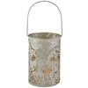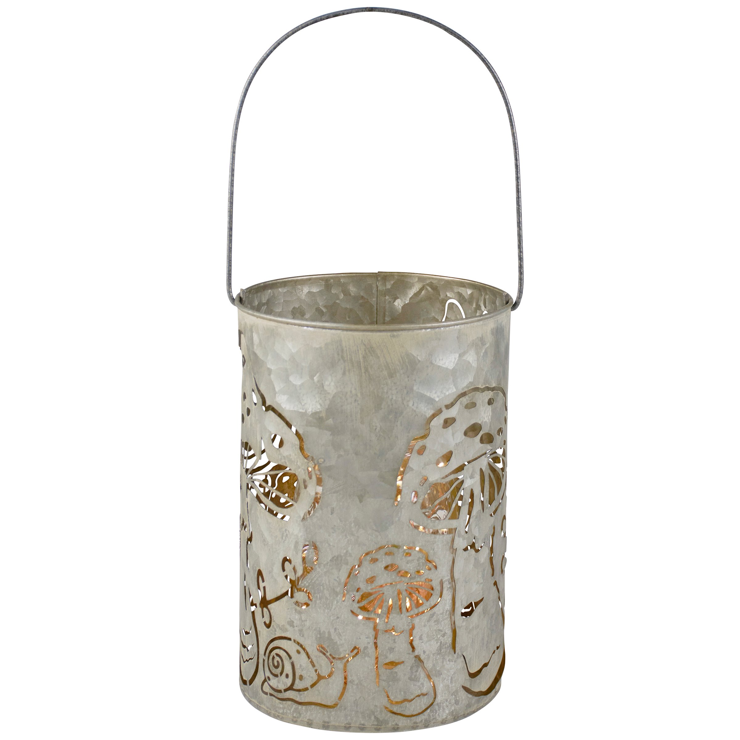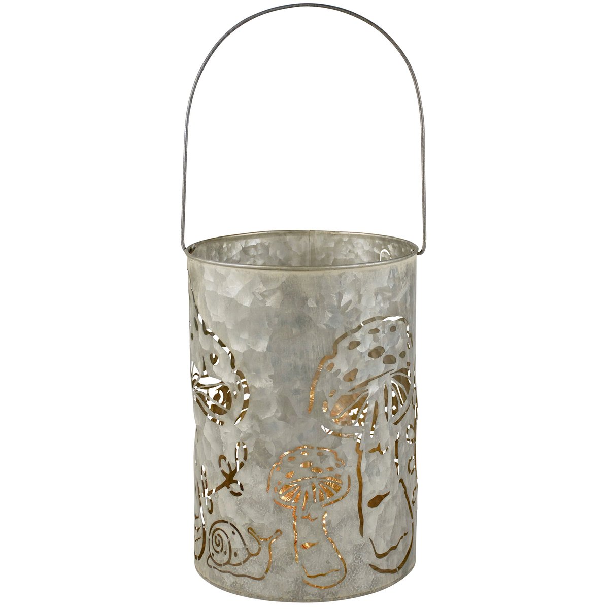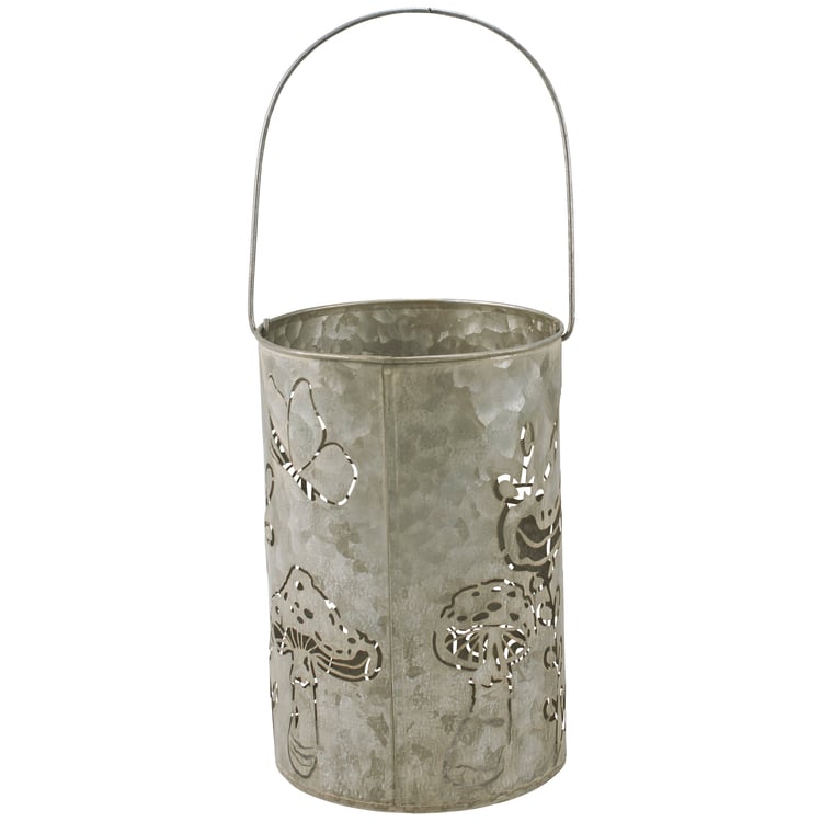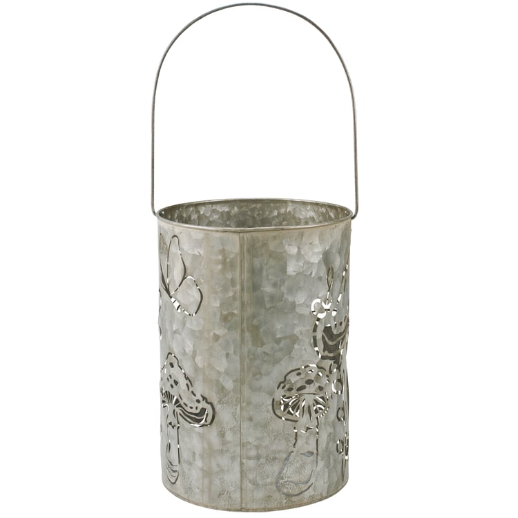 A set of galvanized metal lanterns from our Cottagecore Collection displaying a wrap-around design of mushrooms and snails. Lanterns include space inside to place various light sources and features cutout details to illuminate designs. Candles pictured not included. Set includes two different size lanterns that can nest inside each other for easy storage. Our Mushroom lantern set includes metal wire handles to carry or hang for display. A rustic everyday home accent with a variety of display options.