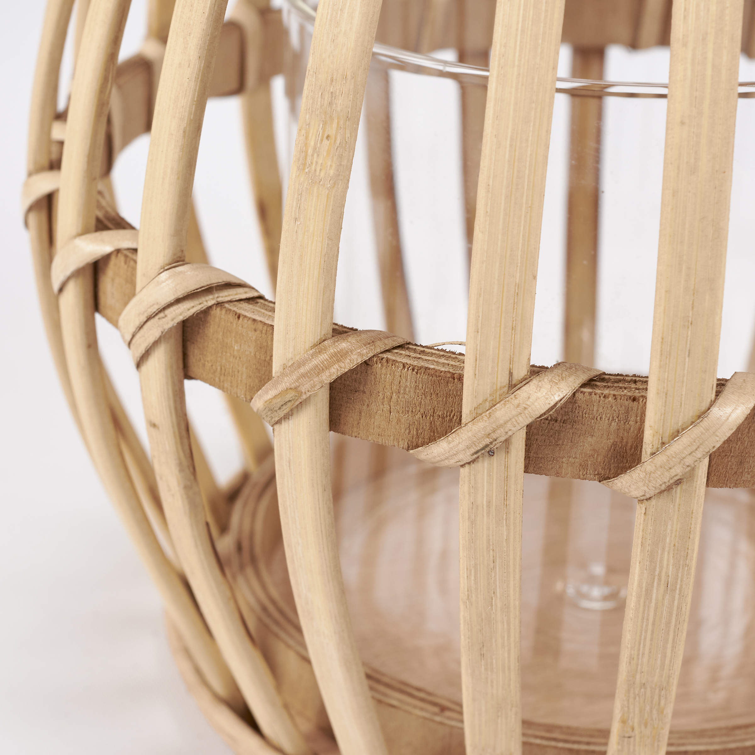 A small lantern from our Home Collection displaying a lattice bamboo design in a neutral color palette. Lantern includes a built-in space inside to hold the included removable glass holder to place various light sources through round opening in the top. Candle pictured not included. Our small Bamboo lantern is a beach-themed everyday home accent perfect for adding natural lighting to any space.