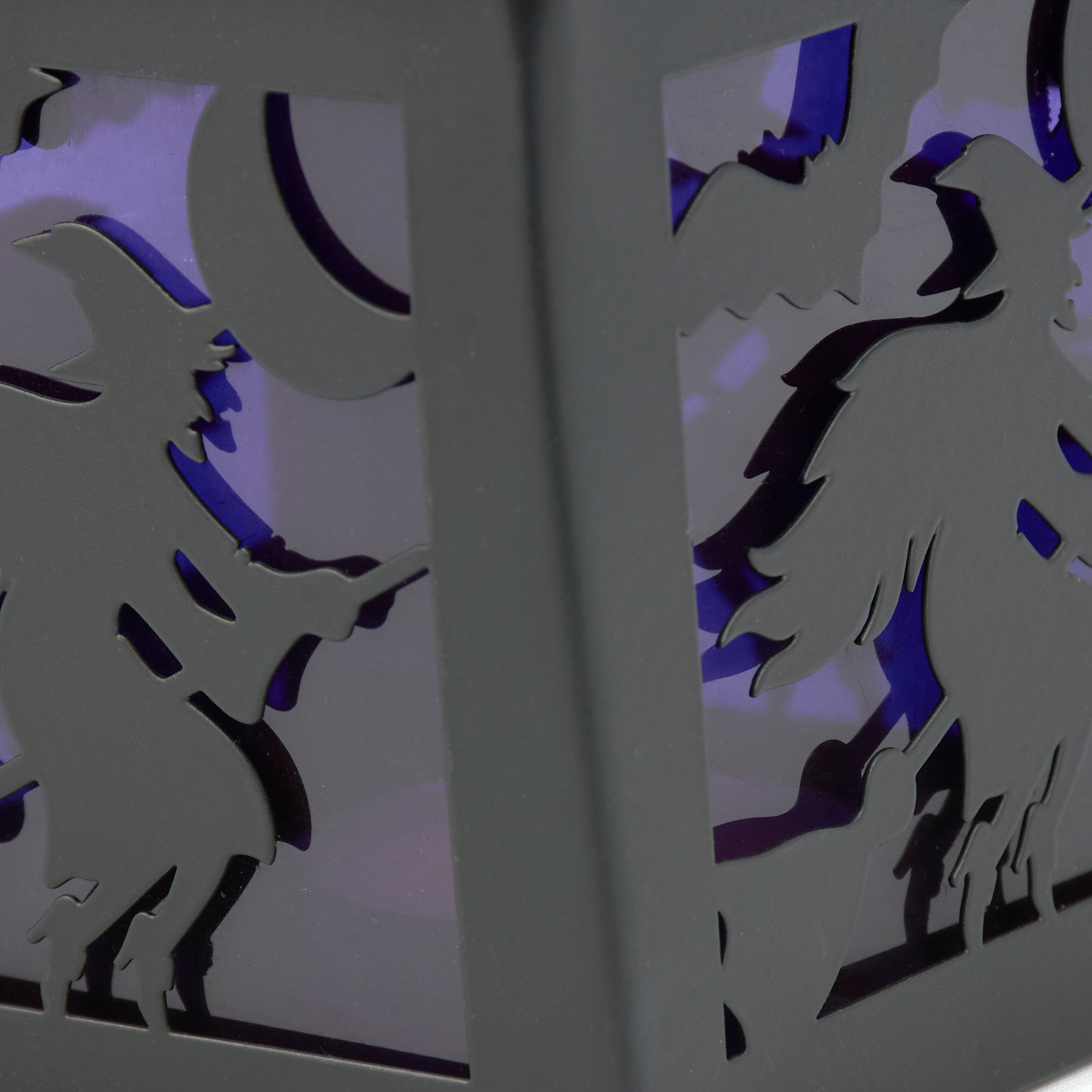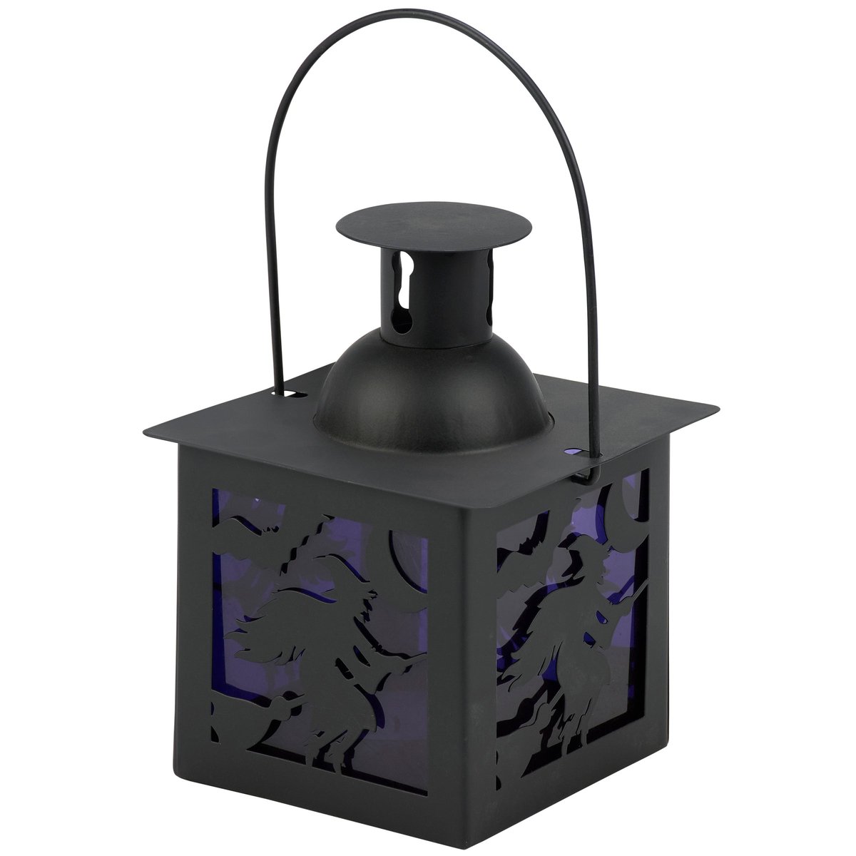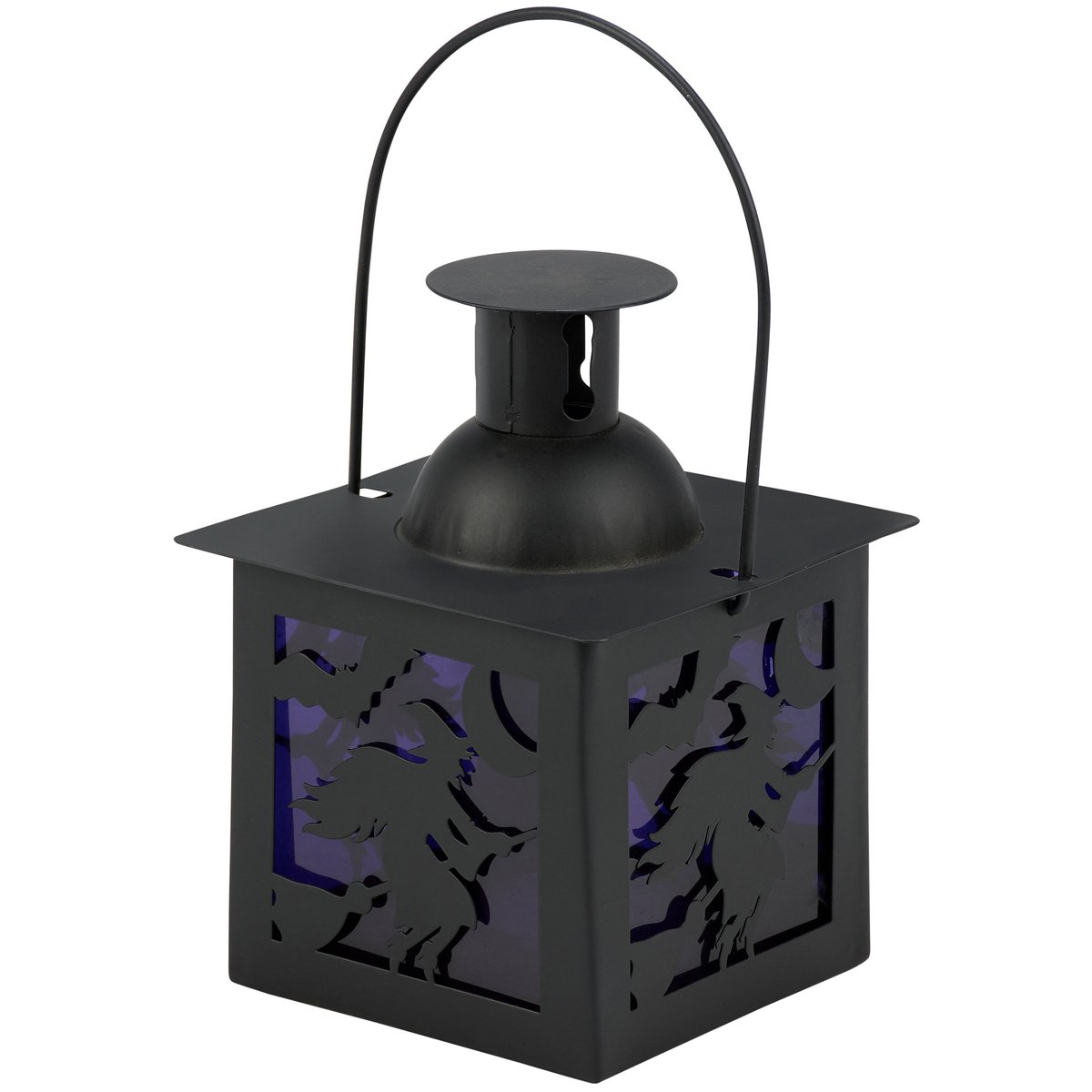A metal lantern from our Halloween Collection displaying a vintage lantern design with cutouts of flying witches on each side. Seasonal lantern includes space inside to place a tealight candle to illuminate cutout designs. Candle pictured not included. Our Witches lantern is designed to free stand on flat surface for display. A vintage Halloween home accent perfect for adding natural lighting to any space.