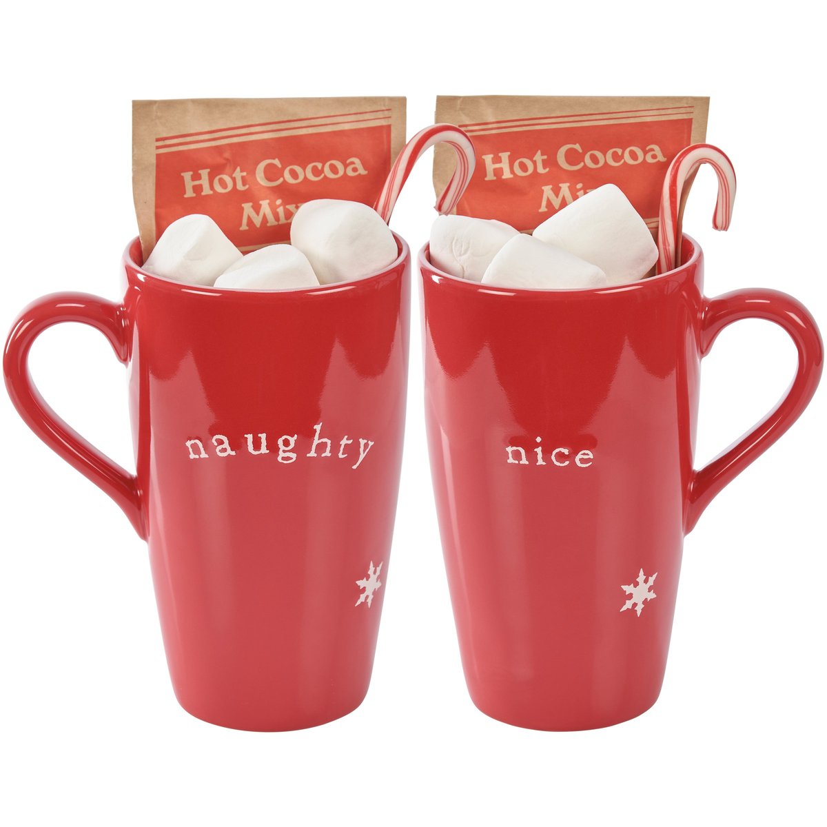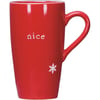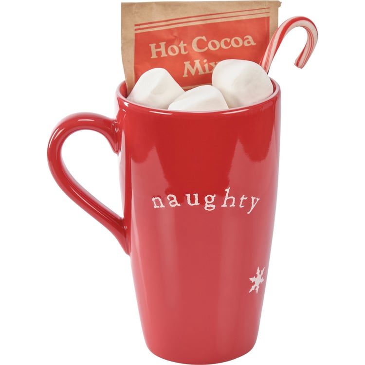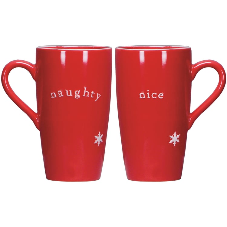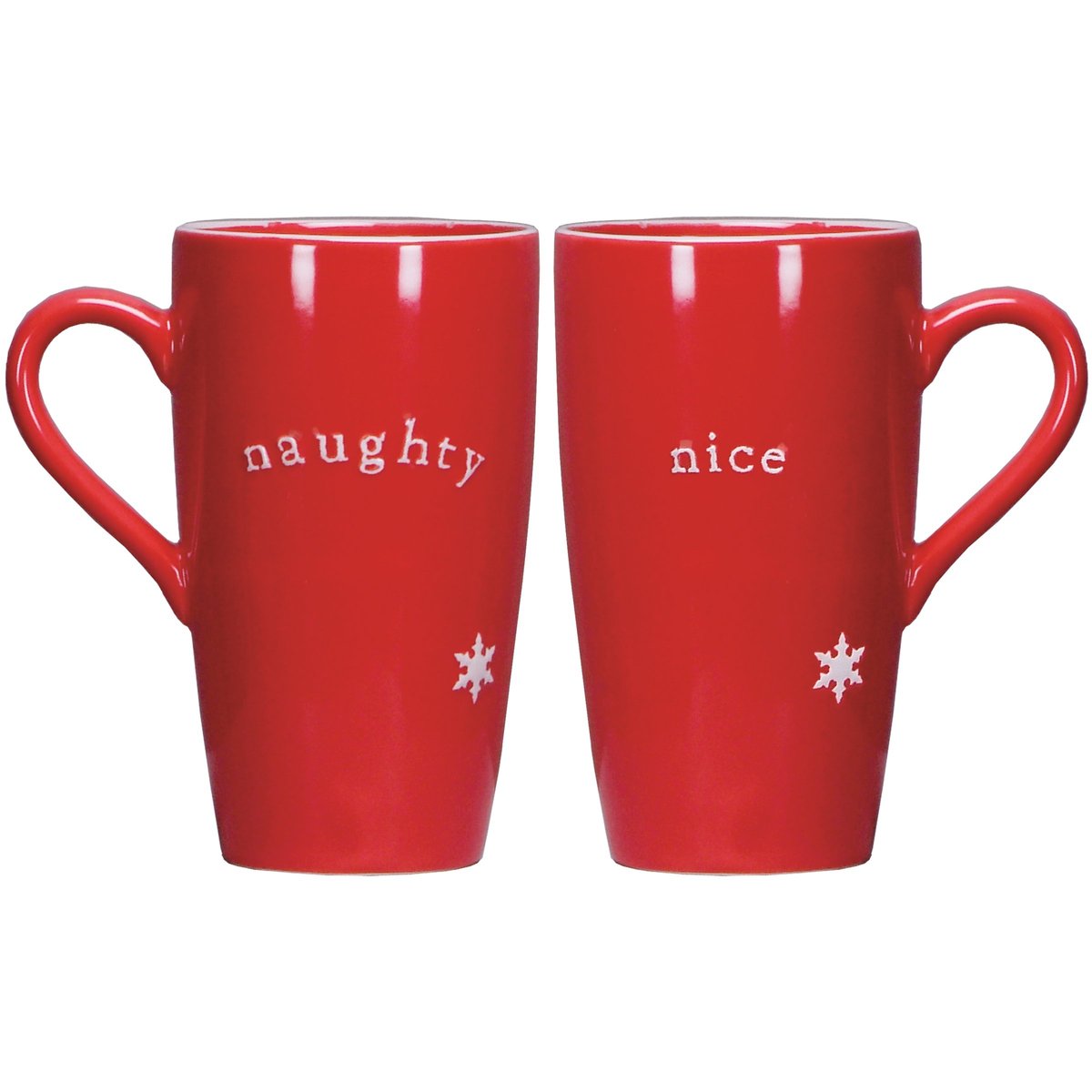 A stoneware latte mug lending double-sided "Naughty / Nice" sentiments with snowflake details. Complements well with coordinating pottery pieces for a charming holiday kitchen collection. Dishwasher, microwave, and oven safe. Holds 16 oz.