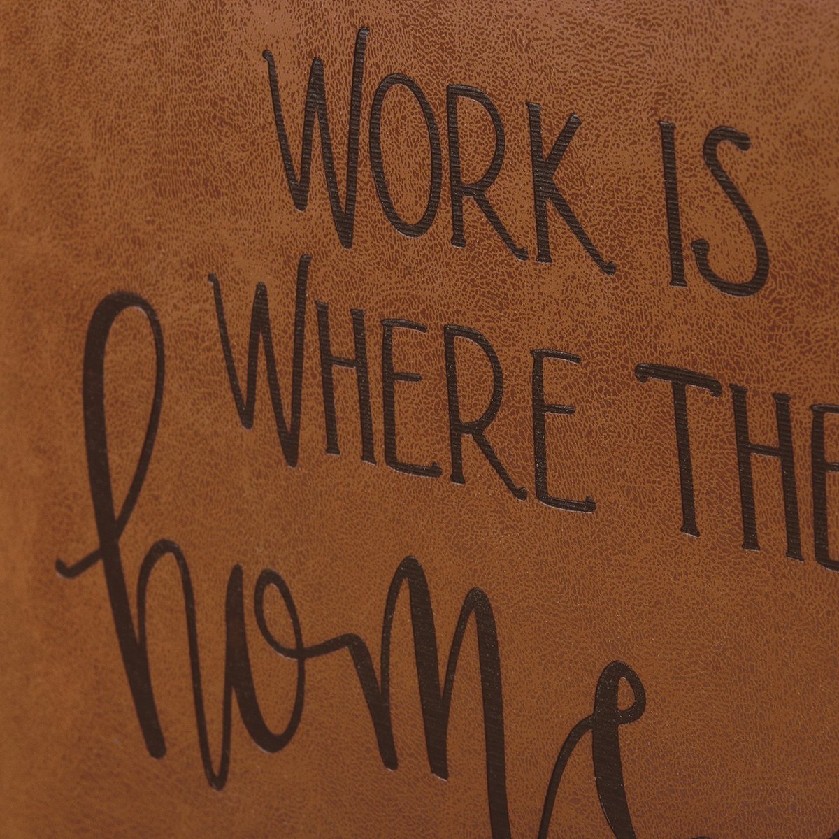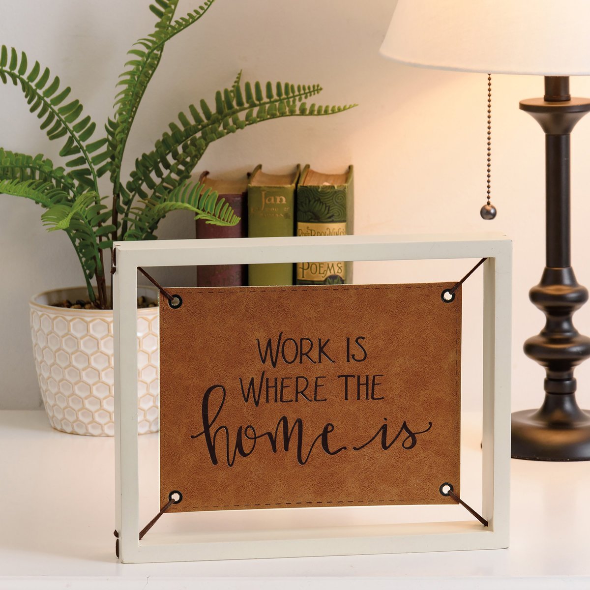 Add a sophisticated touch to your home office with this leather wall art featuring a hand lettered debossed "Work Is Where The Home Is" sentiment. Faux leather is suspended from corners of wood frame via straps looped through metal grommets. Wall art is easy to display using included sawtooth hanger or can free-stand alone.