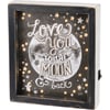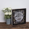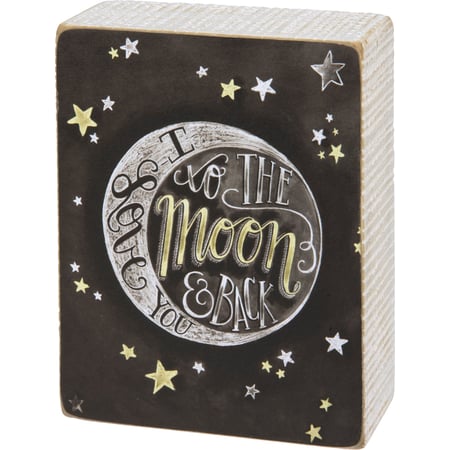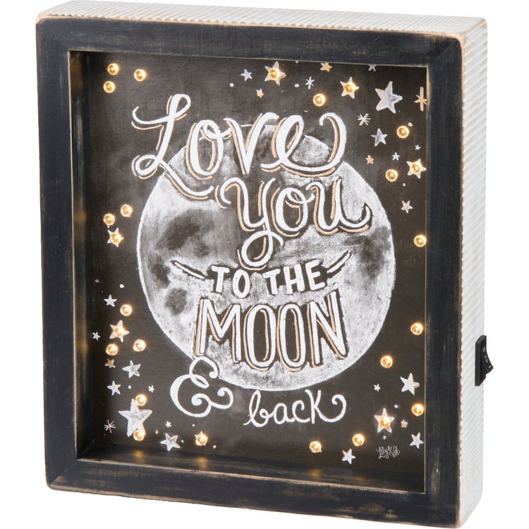 A wooden inset box sign lending a chalk art "Love You To The Moon & Back" sentiment with moon and star designs and light up details. Easy to hang or can free-stand alone. Contains a 6-hour timer; takes 2 AA batteries (not included).