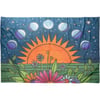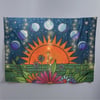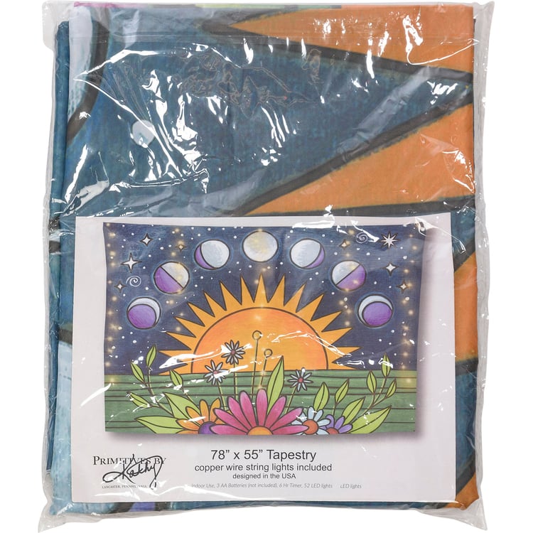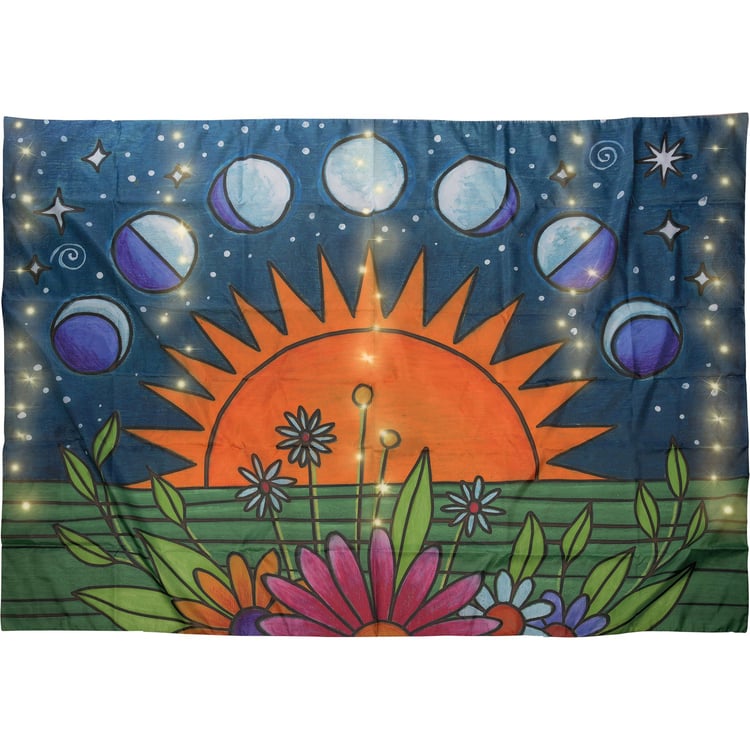 A lighted polyester tapestry featuring colorful and celestial wood burned designs. Comes with 52 individual firefly lights. Lights have a 6 Hour timer. Requires 3 AA batteries (not included). Some assembly required.