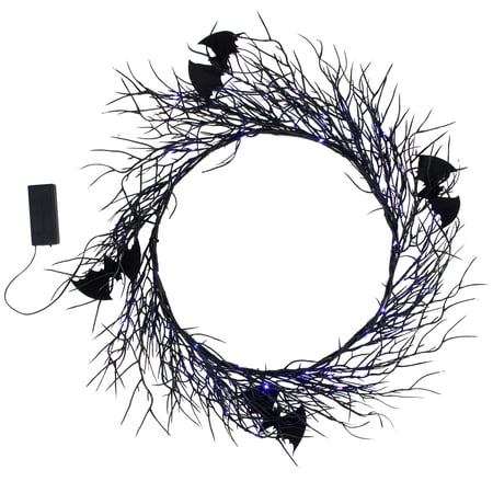 A lighted wreath from our Halloween Collection featuring felt bats on black twisted branches with purple lights throughout. Seasonal wreath includes 45 lights along a 20 inch diameter attached to power source and cord. Our Batty lighted wreath features a convenient 6 hour timer and runs on 2 AA batteries. Batteries not included. Indoor use only. A moody Halloween home accent perfect for adding seasonal lighting to any room.