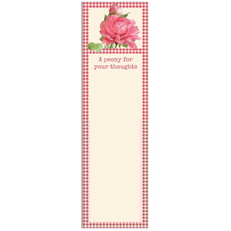 A list notepad from our Garden Collection displaying a vintage design of a pink peony and a pink gingham pattern around writing space with a fun garden-themed pun that reads "A Peony For Your Thoughts." Our A Peony For Your Thoughts list pad includes 60 pages and a strong magnet to easily hang on magnetic surface for display. Proudly made in the USA. A fun garden-themed accessory perfect for adding functional style to any space.