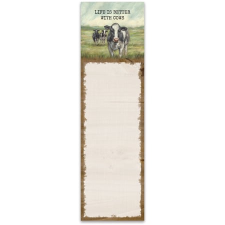 A list notepad from our Farmhouse Collection displaying a charming scene of dairy cows in a field with a farm inspired sentiment that reads "Life Is Better With Cows" and a decorative space underneath for writing. Cow design is replicated from original artwork painted onto burlap canvas, giving the art a unique depth and texture. Our Better With Cows list pad includes 60 pages and a strong magnet to easily hang on magnetic surface for display. Proudly made in the USA. A fun farm-themed gift perfect for adding functional style to any space.